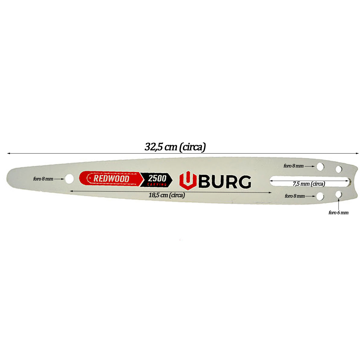 Barra carving 10″ per motosega Burg 25,4 (compatibile per cod. 9804536). Lunghezza: circa 32,5 cm. Fori grandi: 8 mm. Fori piccoli: 6 mm.
