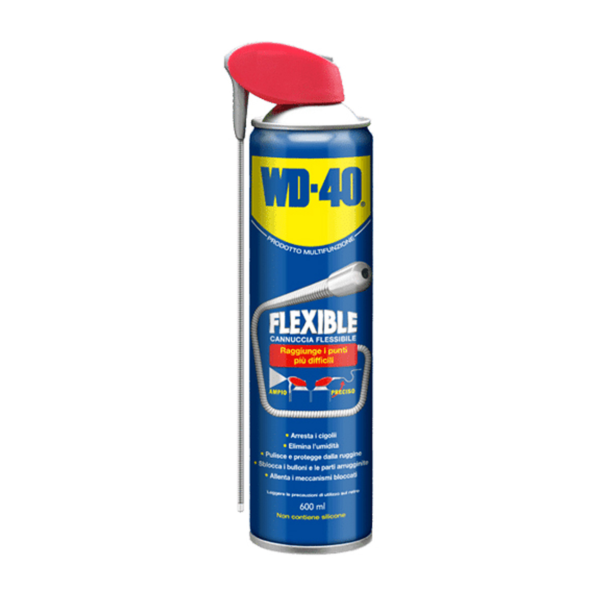 Confezione da 6 pezzi di WD40 FLEXIBLE da 600 ml. Il lubrificante multifunzione più usato al mondo, 5 prodotti in 1. IDROREPELLENTE: l’elevata aderenza di WD-40 al metallo permette il formarsi di una barriera perfetta contro l’umidità. WD-40 si infiltra sotto l’umidità e ricopre completamente qualsiasi superficie, anche quelle che presentano micro irregolarità, eliminando rapidamente i cortocircuiti da umidità. ANTICORROSIVO: la pellicola formata da WD-40 garantisce una protezione contro acqua, umidità, gelo e relativi effetti corrosivi. WD-40 protegge dall’ossidazione e da qualunque forma di corrosione anche nelle condizioni più critiche, in modo duraturo e preventivo. LUBRIFICANTE: uno dei principali componenti di WD-40 è un lubrificante attivo e permanente. WD-40 non contiene silicone, lanolina o additivi che possano attirare polvere o sporcizia, i meccanismi vengono perfettamente lubrificati in modo pulito. SBLOCCANTE: WD-40 sblocca le parti grippate e i meccanismi arrugginiti, bloccati o congelati. L’aderenza al metallo gli permette di penetrare molto rapidamente per capillarità nelle minime porosità del metallo, attraversando così ruggine e strato corrosivo. Le proprietà lubrificanti di WD-40 garantiscono poi il funzionamento costante delle parti sbloccate. DETERGENTE: WD-40 elimina facilmente macchie di grasso, catrame, colla, ecc. da qualunque superficie non porosa sia metallica che in plastica. WD-40 penetra sotto la sporcizia eliminandola, senza lasciare residui di agenti corrosivi. Provvisto di CANNUCCIA FLESSIBILE, in materiale metallico modellabile e resistente (lunghezza 18,5 cm), per arrivare anche nelle zone più difficili da trattare senza dover smontare componenti e coperture. Ideale per i lavori di precisione in diversi settori. DETTAGLI IN SINTESI: – Lubrificante multifunzione. – Con cannuccia flessibile in materiale metallico modellabile e resistente. – Protegge, lubrifica, sblocca e deterge anche i punti più difficili da trattare. – Ideale per i lavori di precisione in diversi settori. – Cartone da 6 bombolette spray da 600 mL.