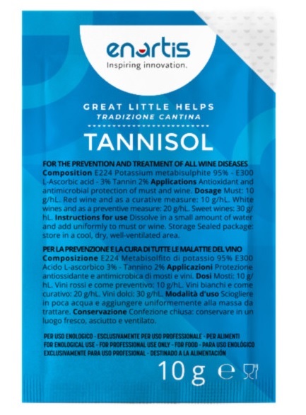 GRANULATO. -potassio matebisolfito(E224)95% CONSERVANTI ANTIOSSIDANTI: -acido L-ascorbico o vitamina C (E300) 3%. ASPETTO:GRANULATO di colore bianco- beige con un leggero odore di anidrite solforosa.Speciale prodottoa base di sostanze solfo-tannico- vitaminiche presenti in dosi proporzionali e ottenuto con speciale procedimento. TANNISOL previene e cura le malattiedelle casse,del girato e del filantepreserva il vino dalle alterazioni ossidative,mantenendo inalterati e brillanti i vini chiarificati e filtrati. APPLICAZIONI: Ideali per vini deboli,di bassa acidità e grado alcolico non elevatoEfficace oltresi nel preservare i vini contenuti in botti non colme. TANNISOL è indispensabile dopo i travasi,durante i trasporti,nei periodi caldi. TANNISOL guarisce i vini colpiti da casse ossidasica,riportandoli alla loro primitiva brillantezza.
