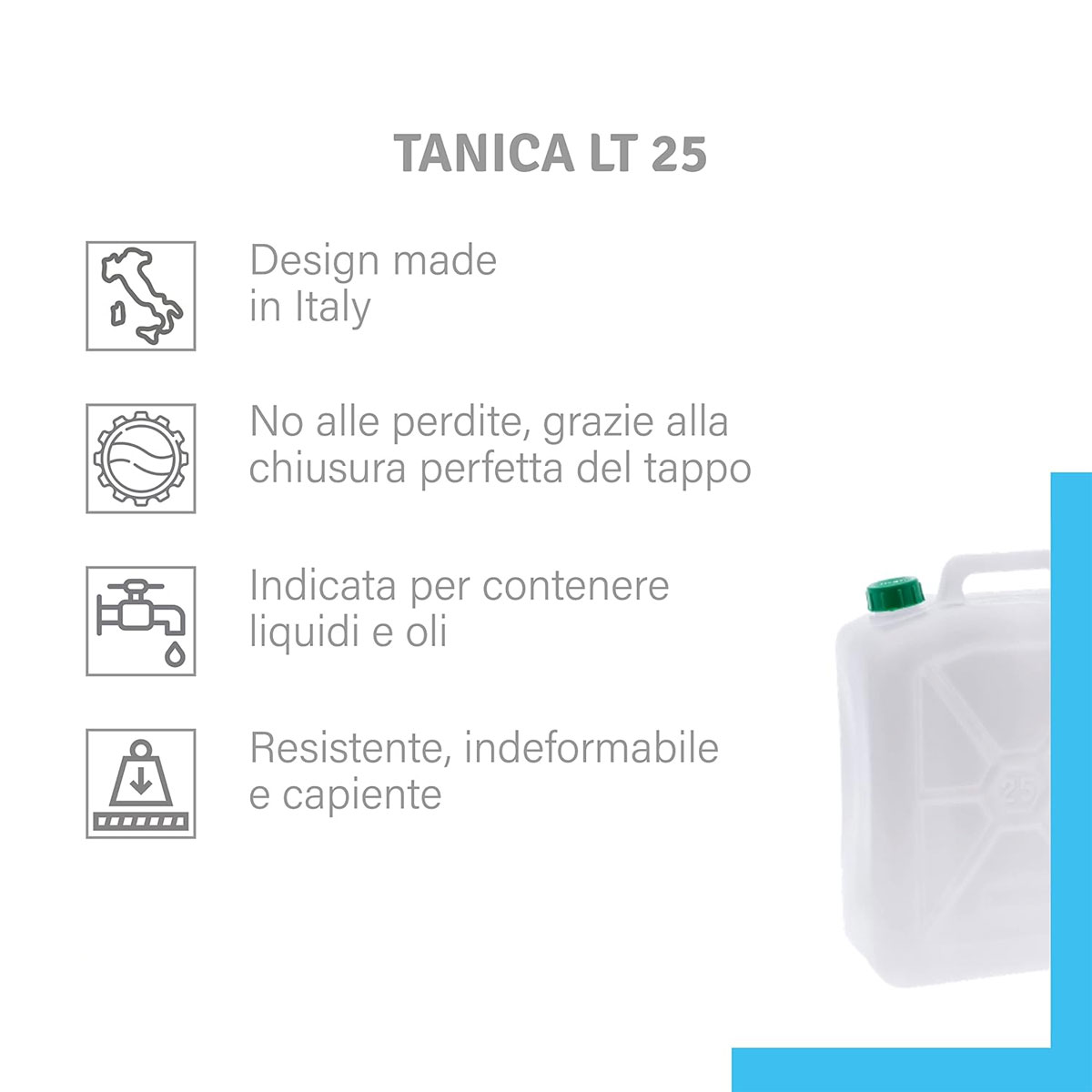 La tanica di plastica è resistente, indeformabile, capiente e comoda da usare. Indicata per contenere liquidi e oli. No alle perdite, grazie alla chiusura perfetta del tappo. Il manico robusto garantisce una presa facile e sicura. Dimensioni: Cm 30,1 x 21,5 x 47 h. Certificazioni aziendali: ISO9001. ISO14001. PLASTICA SECONDA VITA. *Note sui prodotti: – I colori dei prodotti a catalogo potrebbero variare leggermente rispetto a quelli reali. – Foto, descrizioni e caratteristiche dei prodotti sono costantemente aggiornate. – Nonostante gli innumerevoli controlli ed il grande impegno affinché i dati dei prodotti siano corretti, potrebbero verificarsi errori ed omissioni nel caso in cui il fornitore effettui variazioni senza preavviso.*