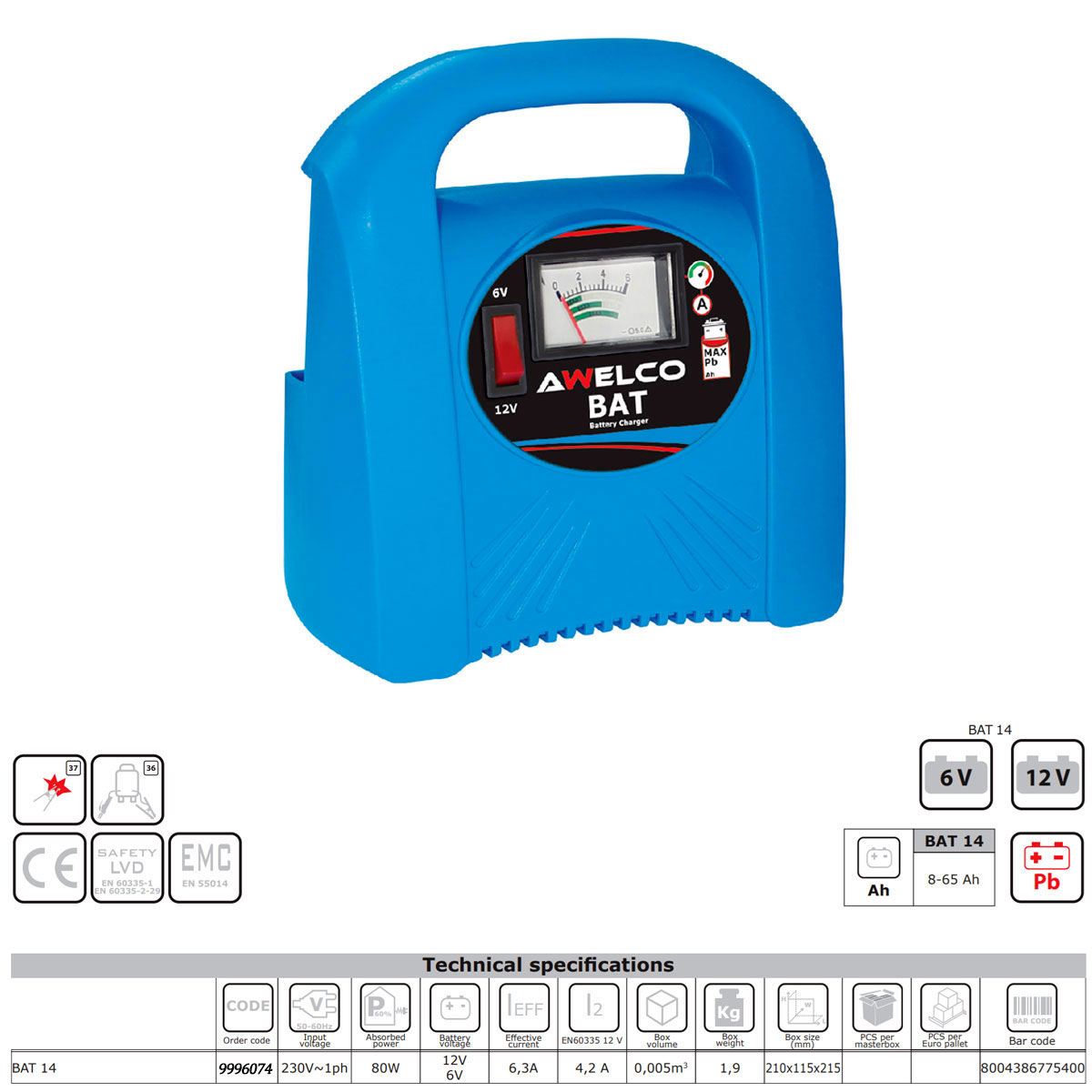 Il caricabatterie Awelco BAT 14 è un caricabatterie portatile e compatto, molto pratico, maneggevole e affidabile. Parliamo di un prodotto facile da utilizzare ed allo stesso tempo dotato di buone performance, è consigliabile per un uso strettamente hobbistico. Piccolo caricatore ideato per l’utente che cerca un prodotto semplice per usi limitati e non intensivi. Tale prodotto è adatto per la ricarica di batterie da 6 Volt e 12 Volt che presentano una capacità da 15 a 70 Ah. Facile non solo da utilizzare ma anche da trasportare grazie alla comoda maniglia e al contenuto peso pari a 1,6 Kg. CARATTERISTICHE TECNICHE: – Potenza assorbita: 80 W. – Tensione di carica: 12 V/6 V. – Corrente media: 4,2A. – Questo prodotto è dotato di presa europea e opera a 230V-1PH. – Corrente di carica (A): 6,3. – Tempo di carica (min.): -. – Tensione di ingresso (V): 230.