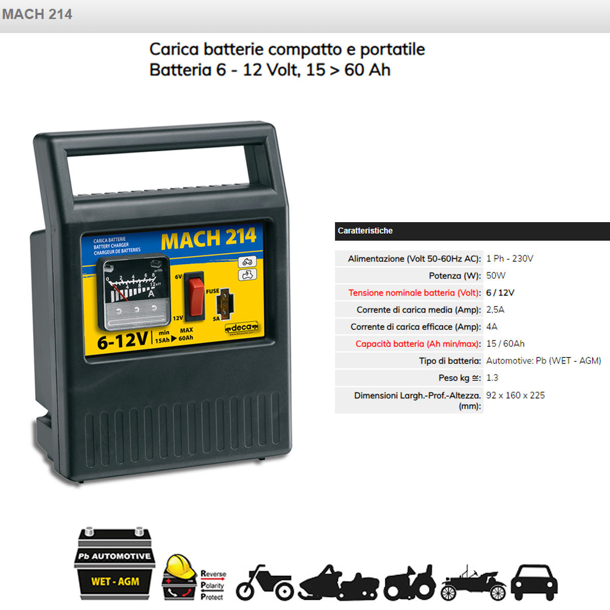 Ricarica batteria al piombo con elettrolita libero. Tensione di batteria 6 e 12v. Protezione contro le inversioni di polarità. Protezione contro i corto circuiti alle pinze. DATI TECNICI: Alimentazione (Volt 50-60Hz AC)1Ph. Potenza (W):50. Tensione nominale batteria 6/12Volt. Corrente di carica media (Amp):2.5. Corrente di carica efficace (Amp):4. Posizione di carica (N):1. Capacità batteria(Ah min/max):15/60. Dimensioni (mm):225x160x95.
