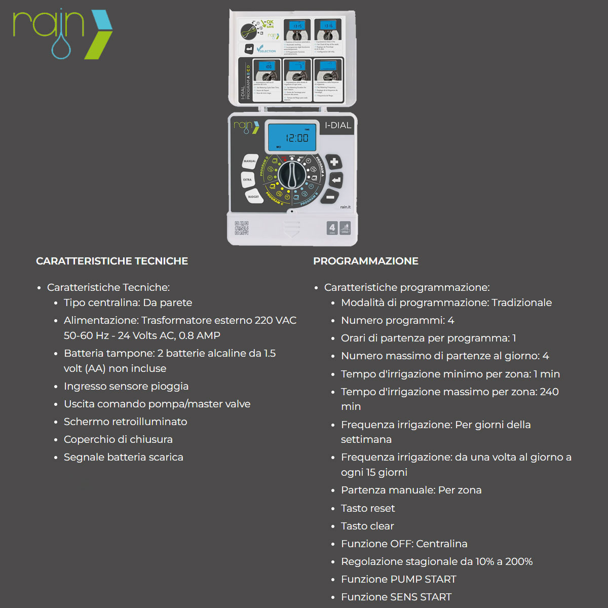 I-Dial Indoor è una centralina dal funzionamento completo studiata per permettere allutente una gestione flessibile dellimpianto. Questa sua versatilità la rende ideale sia per applicazioni residenziali che sportive e comunali. Può comandare fino a 12 elettrovalvole con 4 programmi e 1 partenza ciascuno. La facile metodologia di programmazione 3 Easy Steps consente di regolare lirrigazione in soli 60 secondi. Inoltre, le funzioni extra consentono di gestire a 360° il sensore pioggia e la pompa. Caratteristiche Tecniche: – Tipo centralina: Da parete. – Alimentazione: Trasformatore esterno 220 VAC 50-60 Hz – 24 Volts AC, 0.8 AMP. – Batteria tampone: 2 batterie alcaline da 1.5 volt (AA) non incluse. – Ingresso sensore pioggia. – Uscita comando pompa/master valve. – Schermo retroilluminato. – Coperchio di chiusura. – Segnale batteria scarica. – Numero massimo di zone: 4. Caratteristiche programmazione: Modalità di programmazione: Tradizionale. Numero programmi: 4. Orari di partenza per programma: 1. Numero massimo di partenze al giorno: 4. Tempo d’irrigazione minimo per zona: 1 min. Tempo d’irrigazione massimo per zona: 240 min. Frequenza irrigazione: Per giorni della settimana. Frequenza irrigazione: da una volta al giorno a ogni 15 giorni. Partenza manuale: Per zona. Tasto reset. Tasto clear. Funzione OFF: Centralina. Regolazione stagionale da 10% a 200%. Funzione PUMP START. Funzione SENS START.