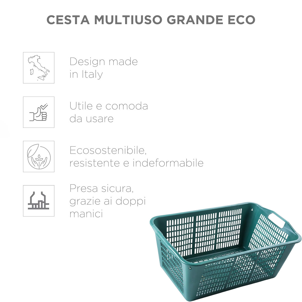 Cesta multiuso per agricoltura è realizzata in materiale riciclato. Robusta, resistente, duratura e indeformabile. Questa cesta è realizzata nel rispetto dell’ambiente. Utile, ecosostenibile e dal design semplice, è dotata di manici che ne facilitano la presa. Utile come cesto portabiancheria, scatola porta oggetti o come contenitore giochi. Cesta per agricoltura realizzata in materiale riciclato. Robusta, resistente, duratura e indeformabile. Questa cesta è realizzata nel rispetto dell’ambiente ed è certificata Plastica Seconda Vita. Utile, ecosostenibile e dal design semplice, è dotata di manici che ne facilitano la presa e la trama a fori è regolare e uniforme. Dimensione: 58x34x23 cm.