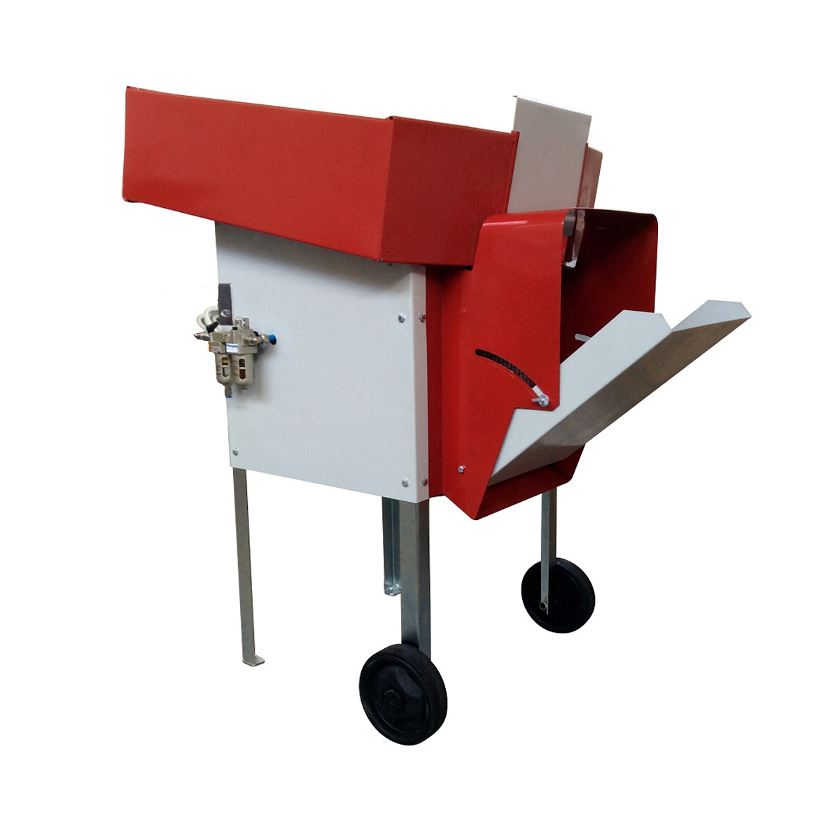 Si tratta di un attrezzo utile per rimuovere foglie e piccole particelle anche da piccoli frutti e granaglie quali:nocciole, mandorle, mais e legumi quali fagioli, ceci, fave, ecc. Il defogliatore è alimentato ad aria compressa, avendo incorporato il gruppo lubrificatore, può essere collegato ad un qualsiasi compressore. Costruito in metallo molto robusto, rifinito artigianalmente motivo per il quale vi si possono trovare delle imperfezioni estetiche che non ne precludono il corretto funzionamento. Compatto e facilmente spostabile grazie alle ruote anteriori. CARATTERISTICHE: Modello: Pneumatico. Alimentazione: Aria compressa. Pressione desercizio: 6,2 bar. Giri min.: 2700. Consumo daria: 180 lt/min. Pressione sonora: 91,5 db. Produzione oraria: 25 quintali. Dimensioni totali: 60x96x102h. Ventola: 19 cm.