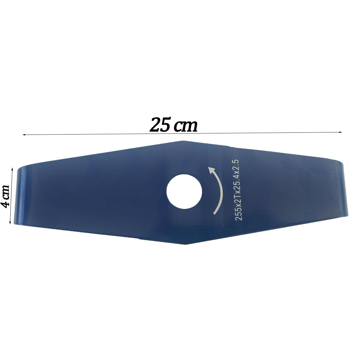 Disco per decespugliatore a due denti CURVI ELICA per lo sfalcio di erba e sterpaglia. Dimensioni: – Diametro 250 mm. – Foro centrale 26 mm (circa). – Spessore 2,5 mm.