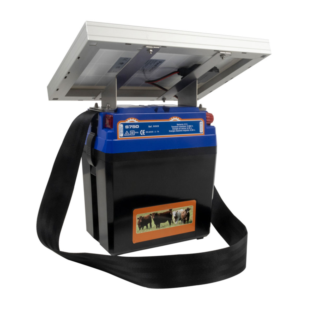 Elettrificatore Ranch AMA S750 a pannello solare 10W completo di batteria ricaricabile 12v12Ah, lunghezza massima del recinto 8KM energia di carica 0,48 Joule. CARATTERISTICHE ARTICOLO: – Tensione nominale: 12 V. – Voltaggio massimo: 9900 V. – Corrente di carica media: 0,7 A. – Intensità di corrente: 12 A. – Lung max forte vegetazione: 1,5 km. – Lung max poca vegetazione: 4 km. – Lung max senza vegetazione: 8 km. – Scarica massima: 0,48 J. – Voltaggio a 500 ohms: 4000 V.