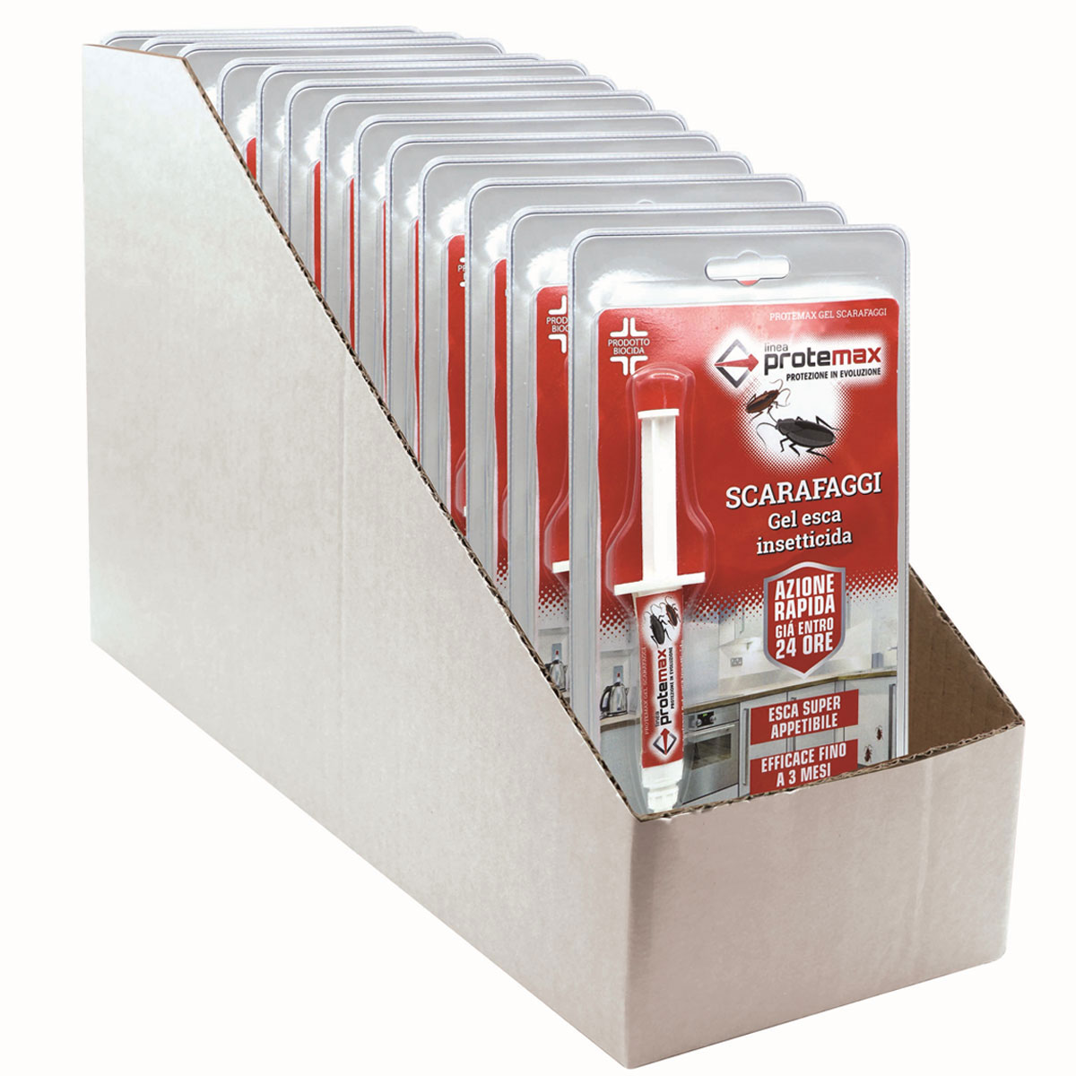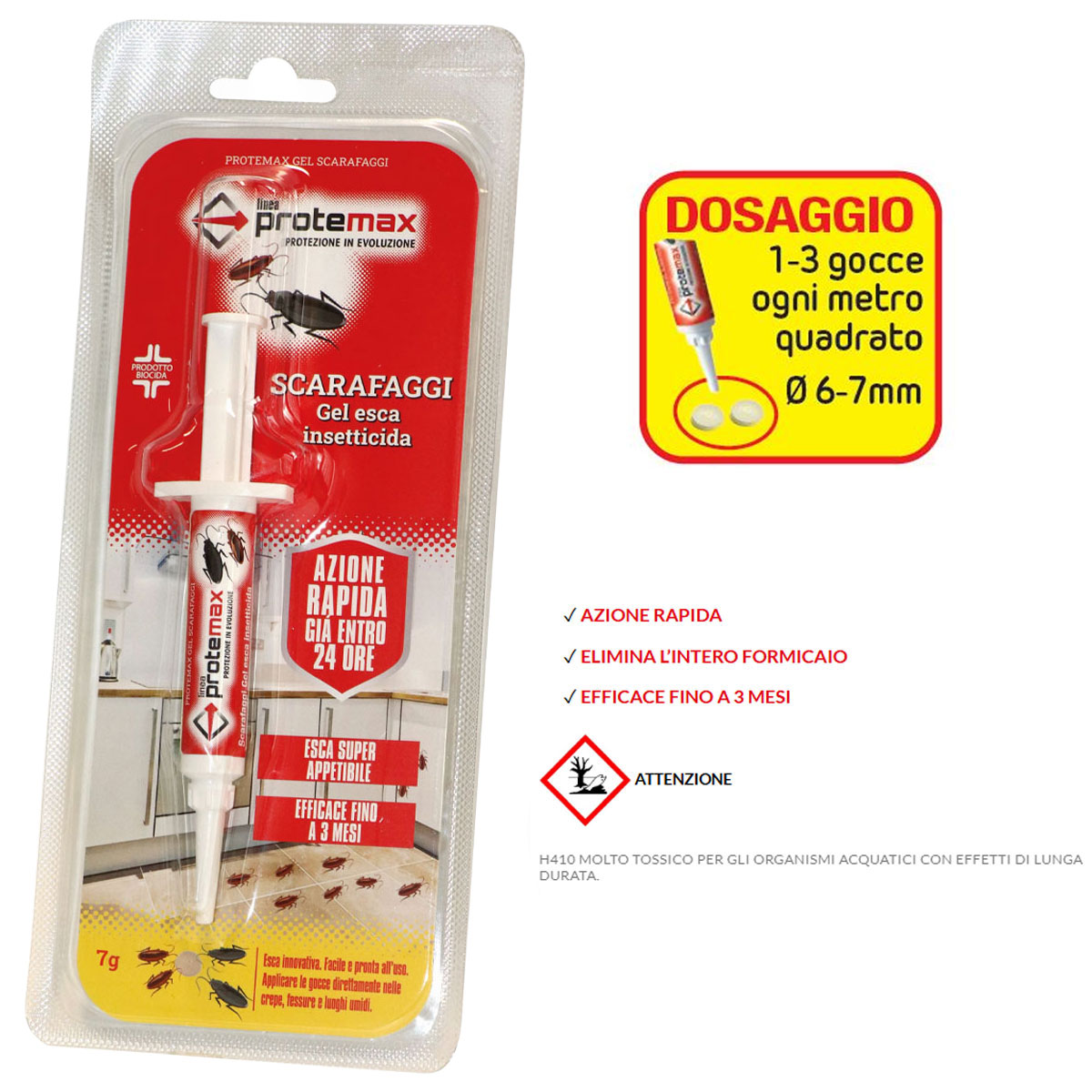 E’ un’esca gel insetticida pronta all’uso per il controllo di scarafaggi con sostanze ad alta appetibilità. Rimane morbido a lungo, dimostrando un’efficacia garantendo la sua efficacia fino a 3 mesi dall’applicazione. Indicato per il controllo degli scarafaggi all’interno di abitazioni e di edifici residenziali o commerciali. Agisce per ingestione dimostrando la propria azione già nelle prime 24 ore fino al controllo dell’intera popolazione entro 1 settimana dall’applicazione. Dose: applicare il prodotto in gocce dove si denota la presenza di scarafaggi secondo i dosaggi indicati. Aree d’impiego: all’interno degli edifici, in crepe e fessure. Composizione: Imidacloprid 2,19% (2,15% puro). Registrazione: Autorizzazione del Ministero della Salute n° IT/2018/00526/AUT. DI LIBERA VENDITA. Usare i biocidi con cautela. Prima dell’uso leggere sempre l’etichetta e le informazioni sul prodotto