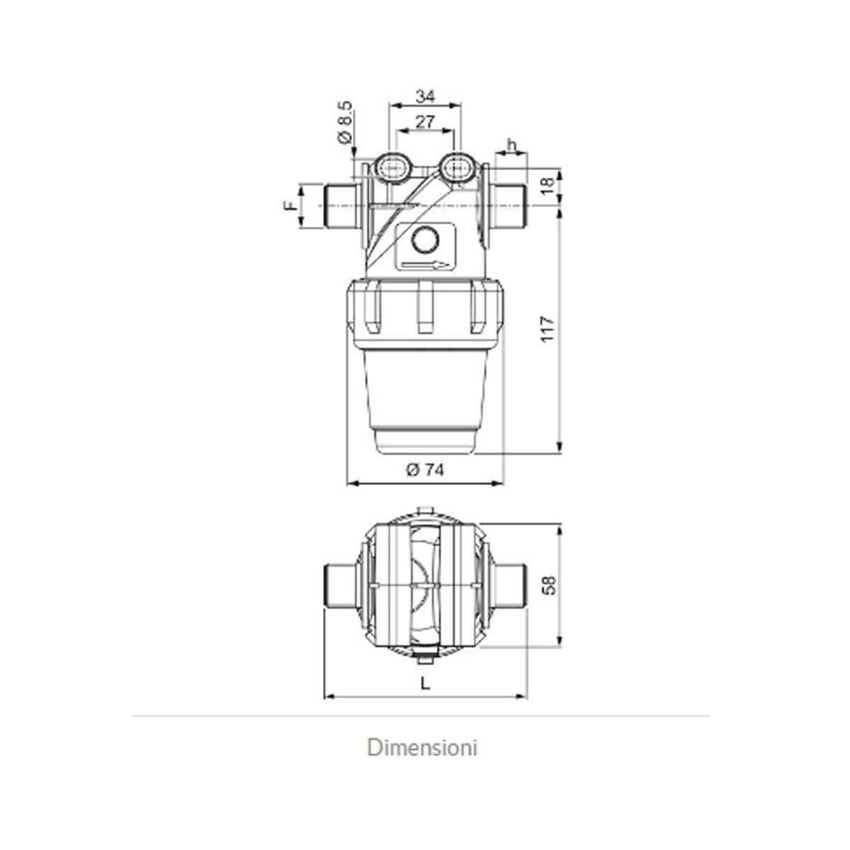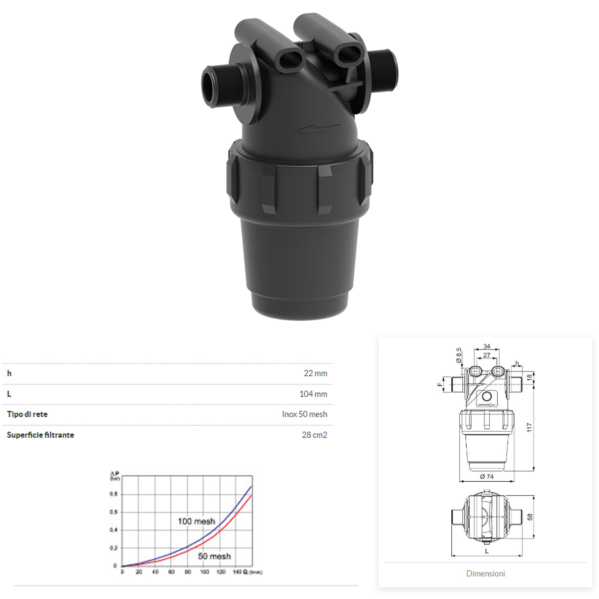 Filtro in linea 3/4” m. 50 mesh. DATI TECNICI: – Filetti maschio e femmina G 1/2” e G 3/4”. – Pressione d’esercizio max. 14 bar. – Capacità filtrante 80÷100 l/min. – Cartuccia Ø 38 x 89 mm. – Punti di fissaggio su entrambe i lati. – Corpo in polipropilene. – Guarnizioni in EPDM. – h: 22 mm. – L: 104 mm. – Tipo di rete: Inox 50 mesh. – Superficie filtrante: 28 cm2.