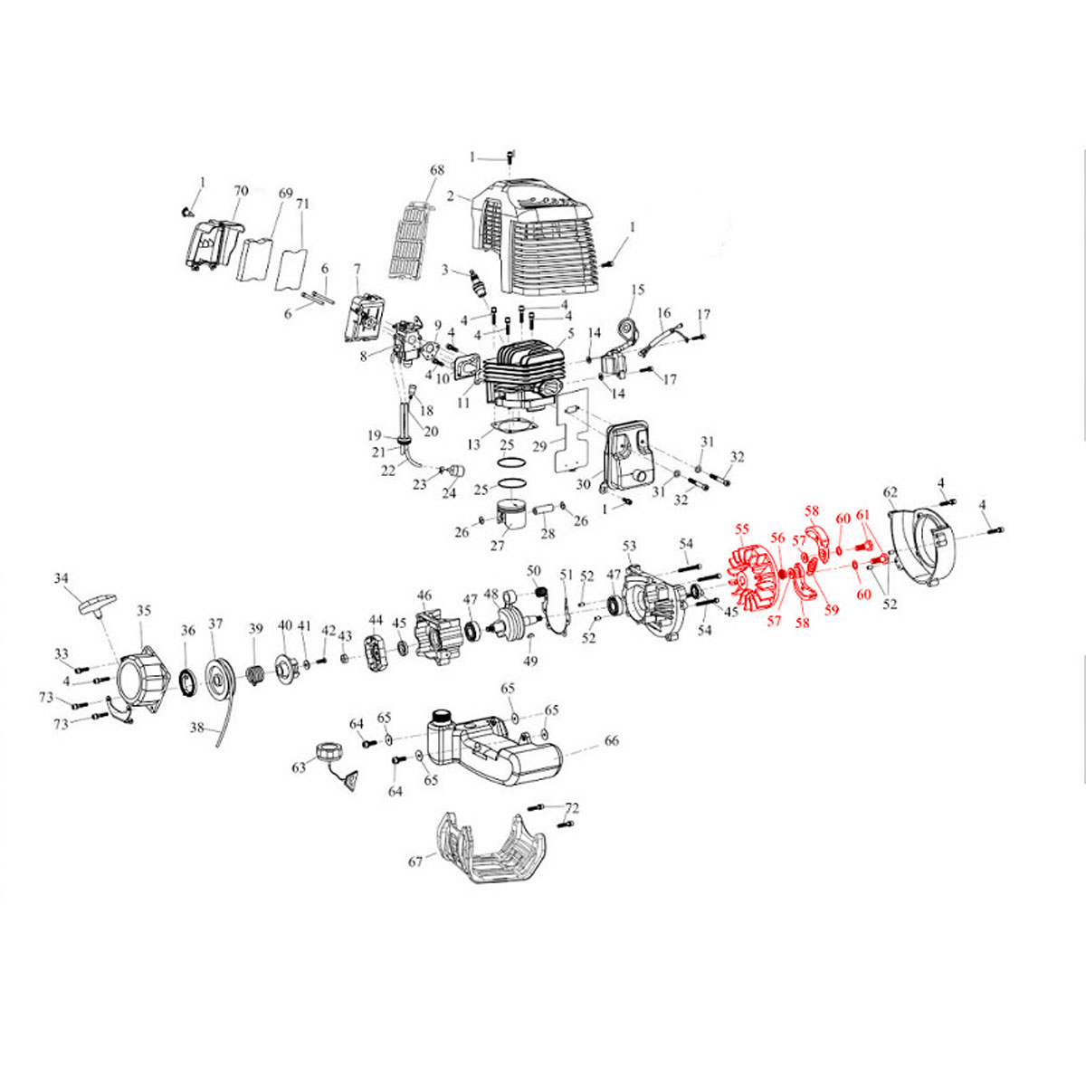 Frizione + volano per mototrivella BURG B-DRILL – ESPLOSO N. 55-56-57-58-59-60-61 (compatibile per codice 6118900).