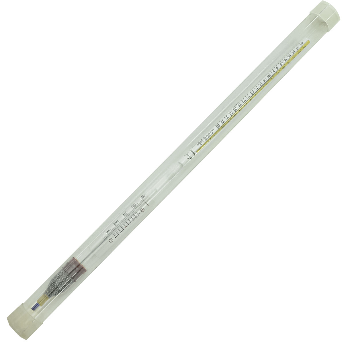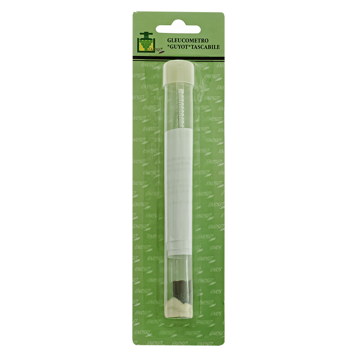 Questo strumento consente di determinare con sufficiente precisione la densità, la qualità di zucchero e il grado alcolico del vino che si otterrà dal mosto in esame. Lo strumento è provvisto di 3 scale graduate che in corrispondenza del punto di affioramento indicano rispettivamente: – la densità del mosto in gradi Baumè (fascia azzurra) – la quantità di zucchero corrispondente a tale densità (percentuale in peso di zucchero: fascia gialla). Il glucometro GUYOT è tarato a 15°C, quando il mosto ha una temperatura diversa, si dovrà: – sottrarre la misura di 0,1 per ogni grado di temperatura inferiore a 15°C. – sommare la misura di 0,2 per ogni grado di temperatura superiore a 15°C. – la quantità di alcool etilico che si otterrà dalla stessa gradazione zuccherina (grado alcolico complessivo: fascia bianca).