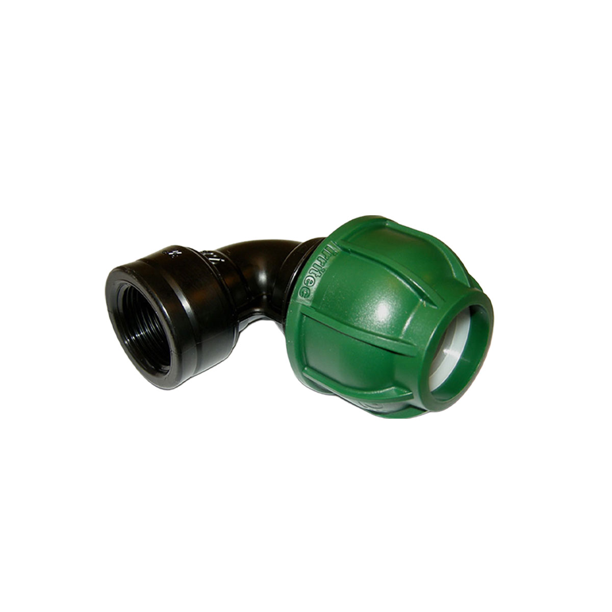 Raccordo a compressione a gomito con derivazione femmina 25×1/2”. Pressione massima di esercizio 10 bar.