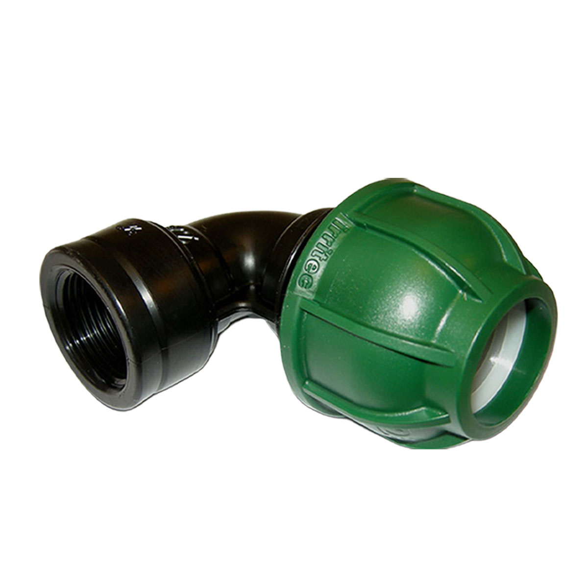 Raccordo a compressione a gomito con derivazione femmina 90×3”. Pressione massima di esercizio 10 bar.