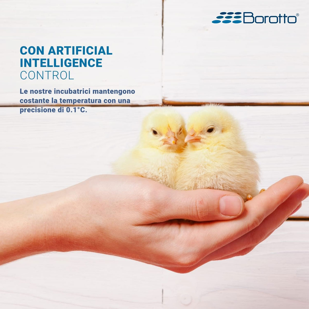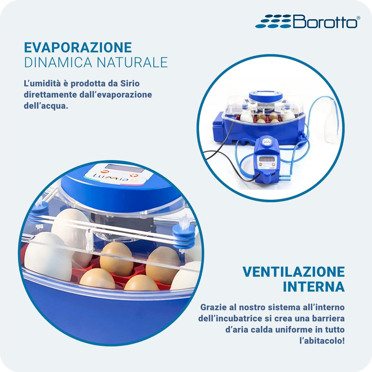 L’incubatrice Borotto è idonea per incubare uova di Gallina, fagiano, faraona, quaglia, starna, pernice, anatra, germano, oca, tacchino, pavone, coturnice, piccione, colino, uccelli esotici e rapaci. Capienza: Sino a 8, per uova di medie e grandi dimensioni (sino a quelle di oca) oppure sino a 32, per uova di piccole dimensioni (tipo quaglia). Tensione nominale: 12VDC. Potenza massima: 50 W. Consumo medio giornaliero: 20 W. Display: Controllo digitale della temperatura con punto decimale. Range: Temperatura modificabile da un Min. di 30°C a un Max. di 40°C. Termostato: Microcomputer a tecnologia PID con precisione +/- 0,1°C. Motore gira uova: 12VDC con inclinazioni e tempi di intervento variabili gestiti da un microprocessore. Ventilazione: Ventilatore assiale 12 VDC silenziato, diametro 60 mm, con funzione Autorestart. Riscaldatore: Resistenza in cavo siliconico FLEX da 50W. Dimensioni e peso: Cm 39X20, alta cm 22. Peso Kg 1,660. CARATTERISTICHE: Con il preciso obiettivo di ridurre la dispersione termica durante le fasi di incubazione e schiusa, LUMIA 8 è realizzata con uno specifico polimero di ABS TERMOISOLANTE con forte resistenza meccanica, che conferisce alla macchina una struttura solida e robusta. Al materiale è aggiunto uno specifico additivo antibatterico a ioni dargento BIOMASTER, che impedisce la dannosa.