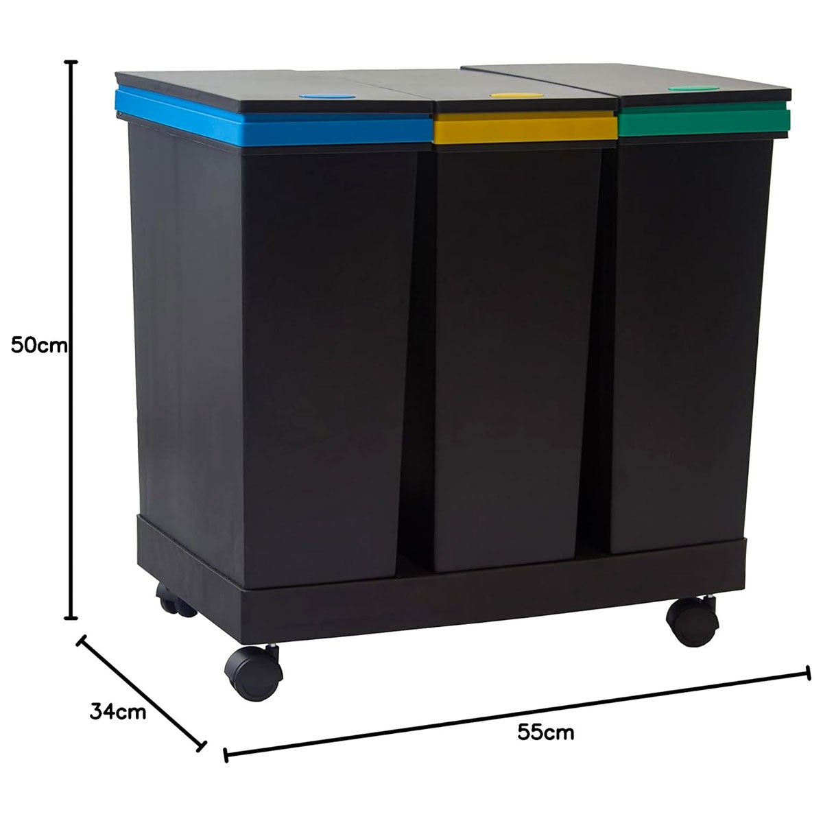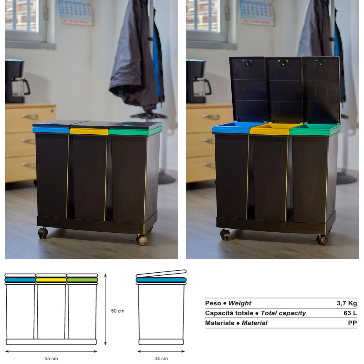 I contenitori per lo smaltimento dei rifiuti sono dotati di 4 ruote molto robuste in modo da poter essere spostati facilmente e comodamente anche a pieno carico. I coperchi sono dotati di un sistema di apertura a molla a pressione, tramite una molla a rilascio, che ne rendono molto agevole l’utilizzo senza dover ricorrere a pedali, fili, ecc… Costituito da tre contenitori da 21 litri ciascuno (63 litri totali) separati, montati su un’unica base per creare un’isola posizionabile in casa, giardino, balcone, ufficio e in tutti quei luoghi dove necessita. E’ un prodotto che si distingue per la sua modularità, infatti i contenitori vengono facilmente inseriti su una robusta base in plastica creando un insieme armonioso e funzionale. Anche le operazioni di sostituzione del sacchetto sono molto semplici grazie al sistema ad anello. Dimensioni di ogni secchio: 170 x 340 x 450 mm (larghezza x spessore x altezza). Dimensioni complessive: 550 x 340 x 500 mm (larghezza x spessore x altezza). Made in Italy.