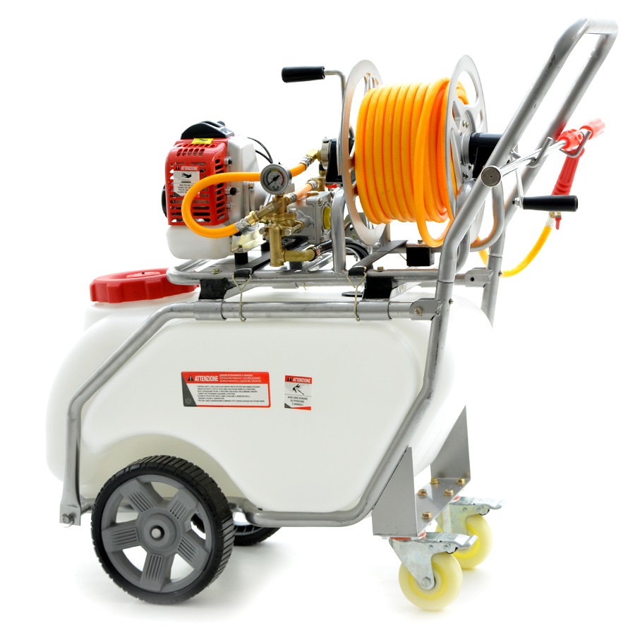 Carriola Irroratrice con serbatoio della capacità di 50 litri. Motore a scoppio 2 tempi, MISCELA 4% Pressione 15-25 Bar. Tubo Ø interno 8,5mm, Ø esterno 14mm. Pompa con corpo metallico. Fornito di avvolgitubo e lancia a manopola 100 cm. Ideale per trattamenti di irrorazione, prodotti antiparassiti, diserbo e per la distribuzione di concimi liquidi in soluzione. Per trattamenti di irrorazione di serre, giardini, aiuole e orti e per la disinfezione di ambienti sia aperti che chiusi. Per lavaggio di impianti fissi industriali, fognari e di spurgo. Carriola fornita di avvolgitubo, tubo da 20 metri alta pressione e lancia a manopola da 100 cm CARATTERISTICHE Cilindrata motore 25.6 cc Potenza motore 0.75 kW – 2 tempi Portata 6 l/min Pressione 15-25 bar Distanza max irrorazione 8 m Capacità serbatoio 50 lt Lunghezza tubo 20 mt Lunghezza lancia manopola 100 cm Dimensioni 99x51x86 h Alimentazione Miscela 4%