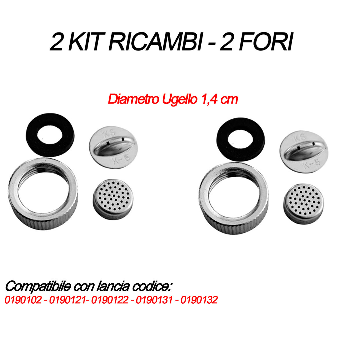 Kit 2 ricambi per lancia doppio getto – 2 fori: filtro, ugello da 1,4 cm 2 fori, guarnizione. Ricambio compatibile per cod. 0190102 – 0190121 – 0190122 – 0190131 – 0190132.