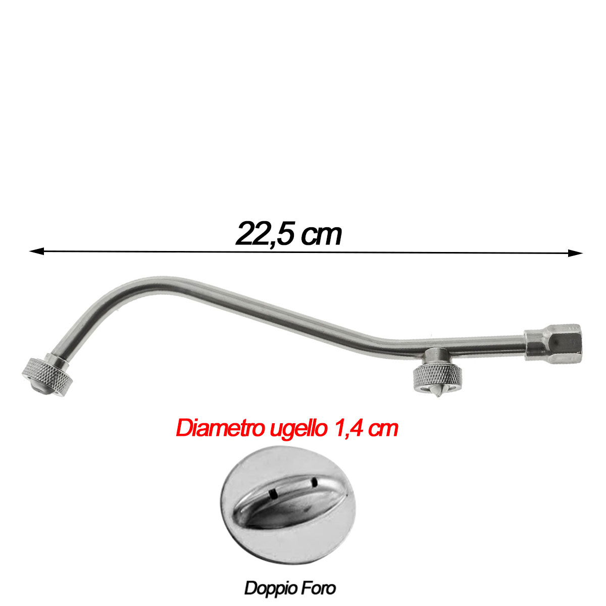 Lancia doppio getto ad alta pressione, eccellente per l’agricoltura e l’uso in giardino. Doppio foro per ugello. 2 teste: lunghezza circa 22,5 cm. Diametro ugello: 1,4 cm.