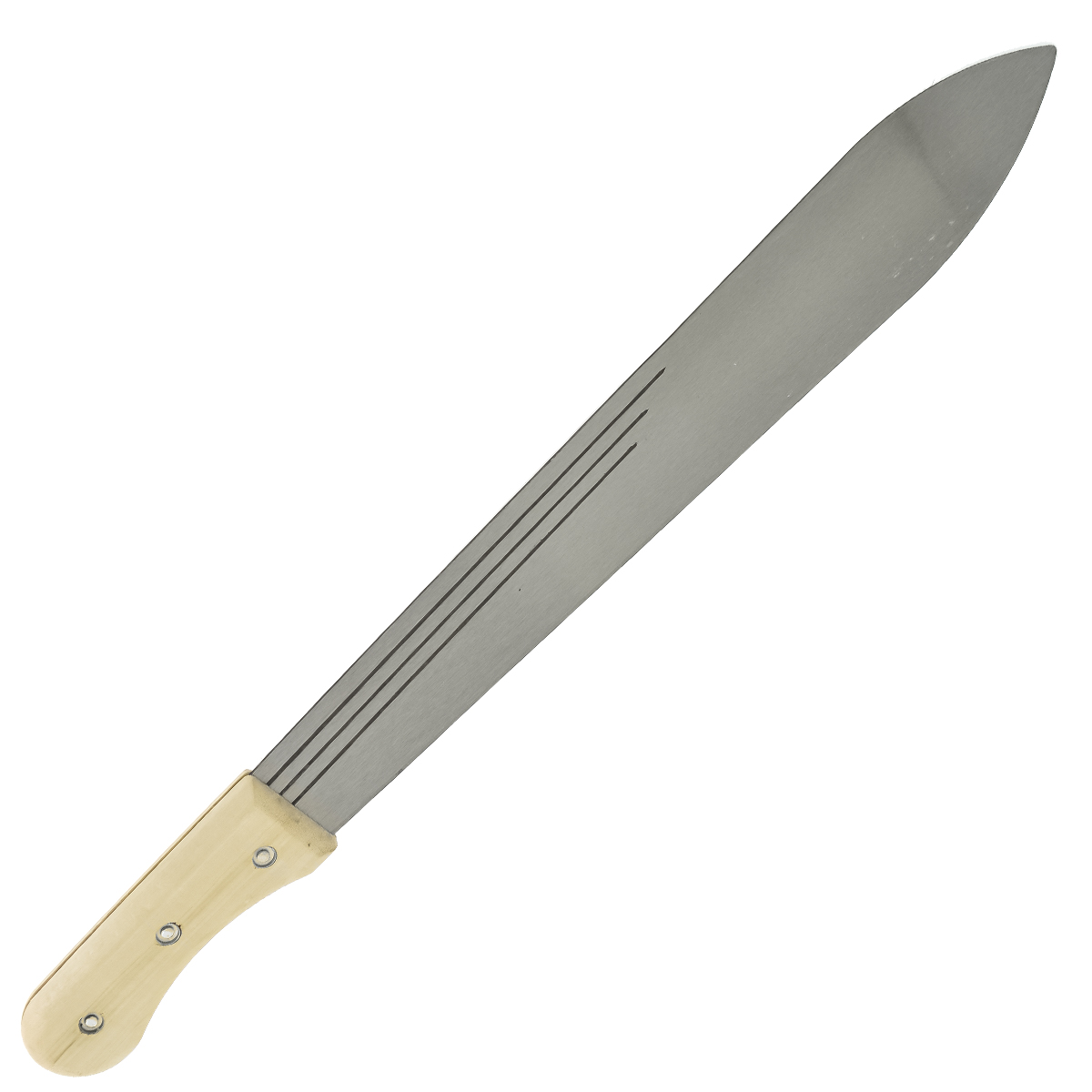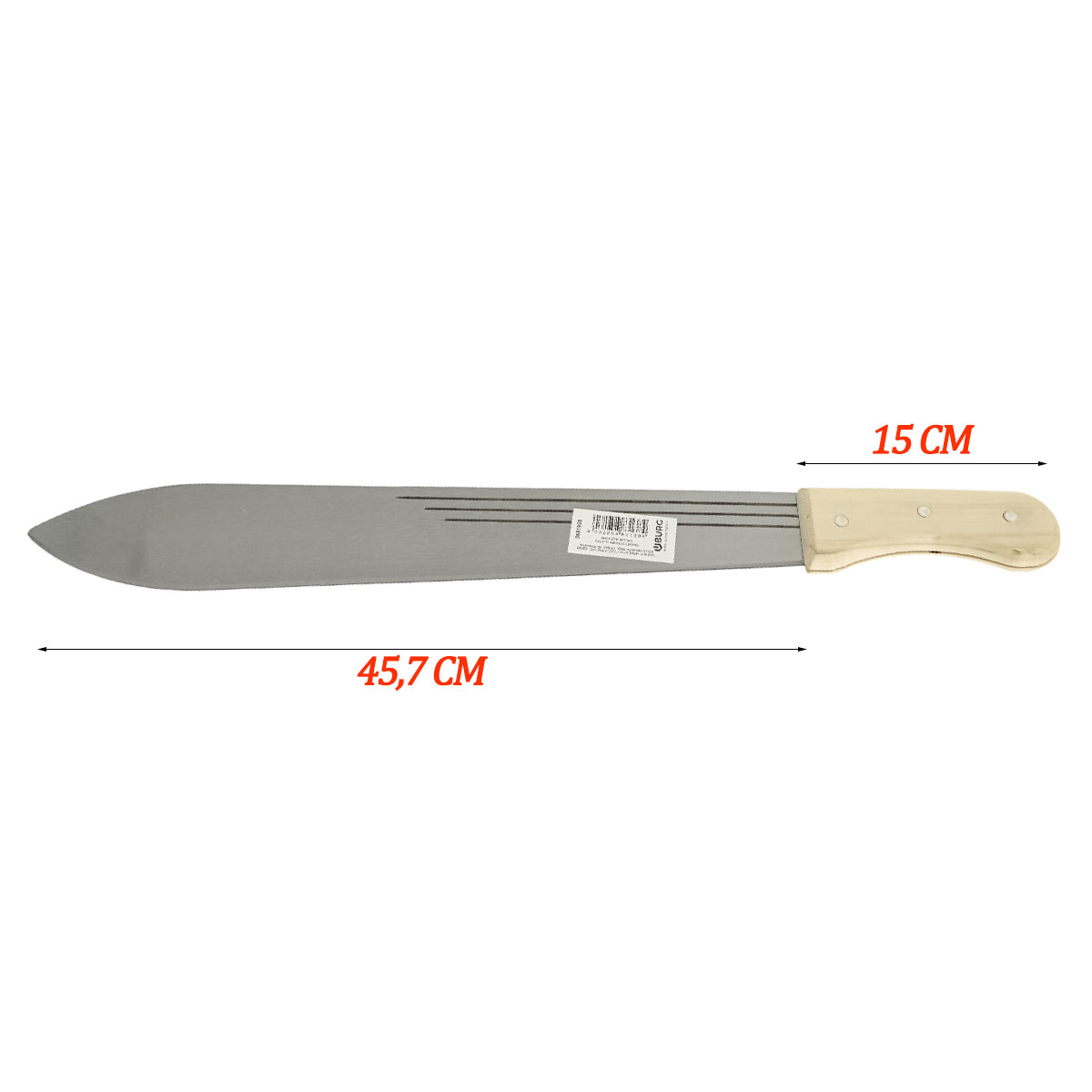 Machete dritto con manico in legno. Lunghezza totale: circa 61 cm. Lunghezza della lama circa: 45,7 cm. Lunghezza manico in legno: circa 15 cm. Larghezza della lama: circa 6-7 cm. Spessore lama: circa 1,8 mm.