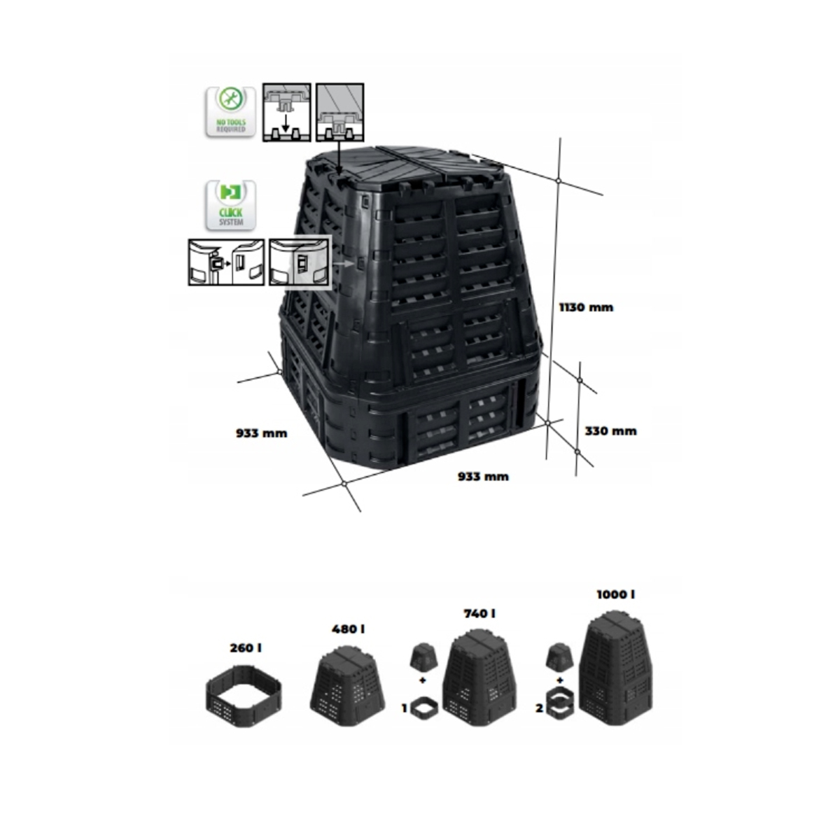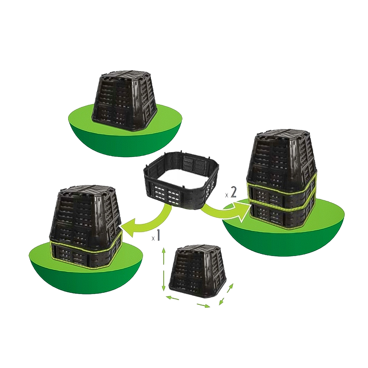 Modulo di ingrandimento della compostiera. Con esso puoi aumentare la capacità della compostiera di 260 litri. Possibilità di montare la porta della compostiera da qualsiasi lato della stessa. Dimensioni: 93,3×93,3×33 cm. Compatibile con compostiera da giardino da compostiera da 480 Litri (Cod. 8600000).