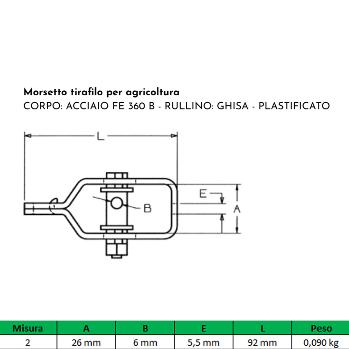Morsetto tirafilo n.2 per agricoltura. CORPO: ACCIAIO FE 360 B – RULLINO: GHISA – PLASTIFICATO.