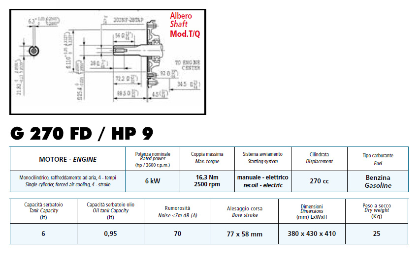 G 270 FD / HP 9 Albero: Cilindrico Motore: Benzina Potenza nominale: 6 Kw Coppia massima: 16,3 Nm 2500 rpm Sistema di avviamento: elettrico Cilindrata: 270 cc Capacità serbatoio: 6 lt Capacità serbatoio olio: 0,95 lt Rumorosità: 70 dB Alesaggio corsa: 77×58 mm Dimensioni: 380x430x410 mm Peso a secco: 25 kg
