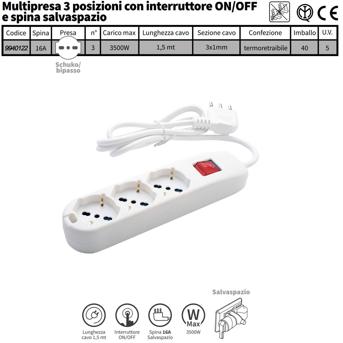 Ciabatta multipresa con 3 posizioni Shuko universale bipasso 16A e 1 interruttore ON/OFF. Le prese sono posizionate a 45 gradi rispetto alla struttura. Interruttore rosso on/off di alimentazione. Struttura con ganci per appendere la multipresa. CE. Carico MAX 3680W. Lunghezza cavo 1,5 m. Sezione cavo 3×1 mm. Alimentazione tramite spina 16A. Colore Bianco.