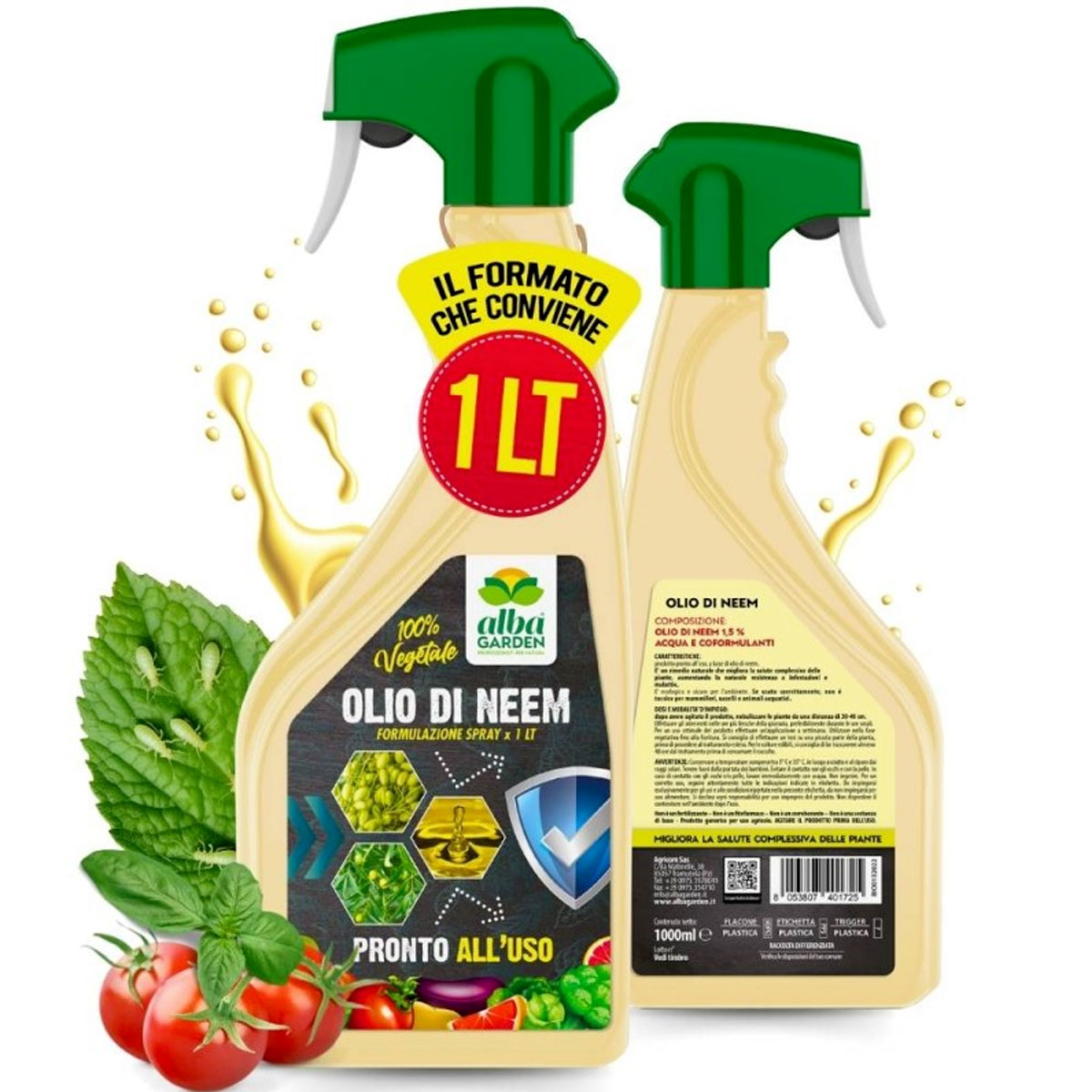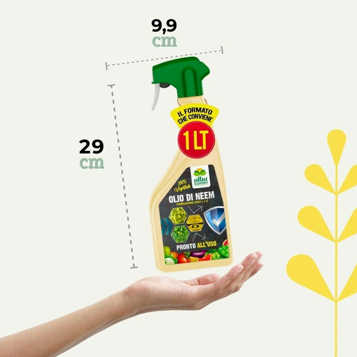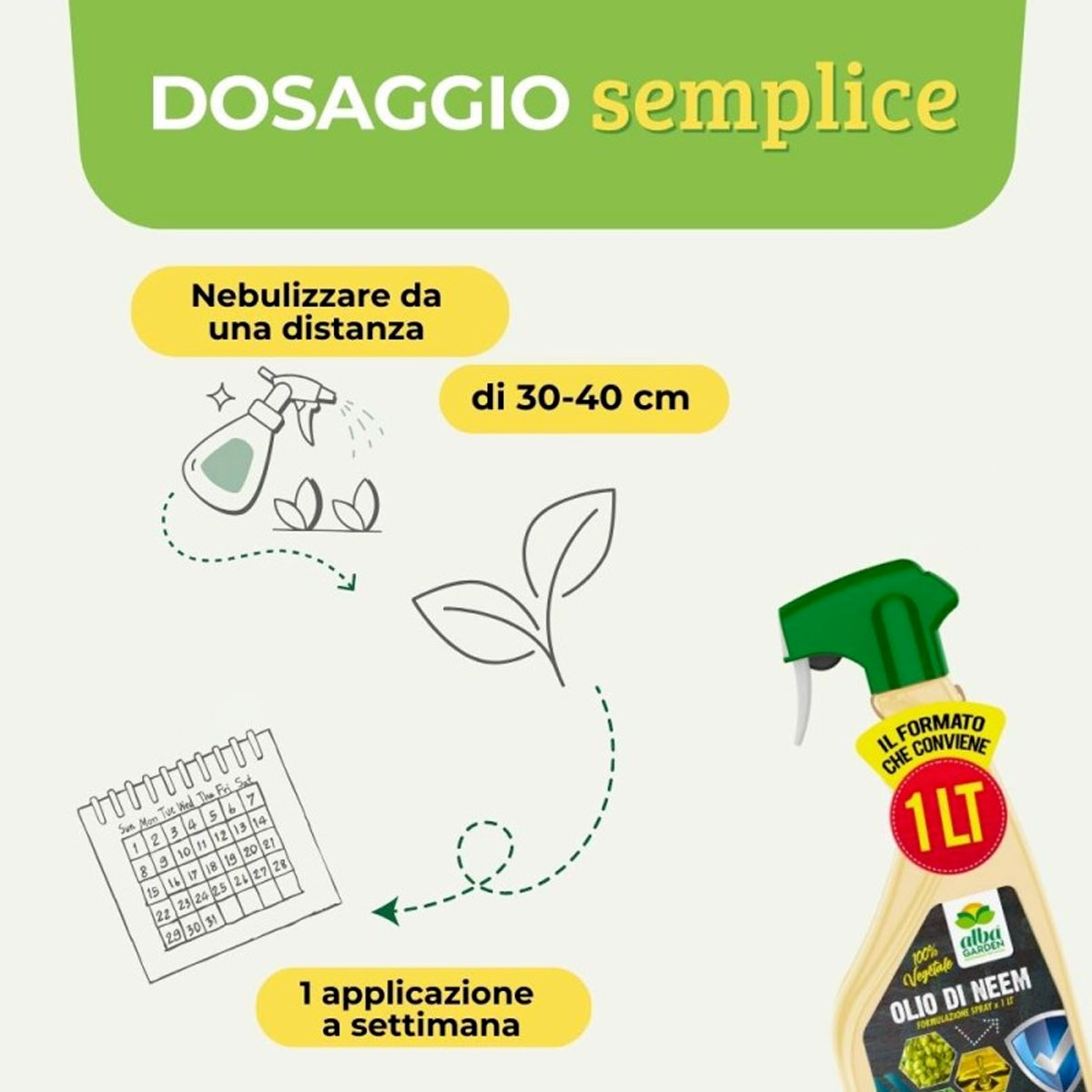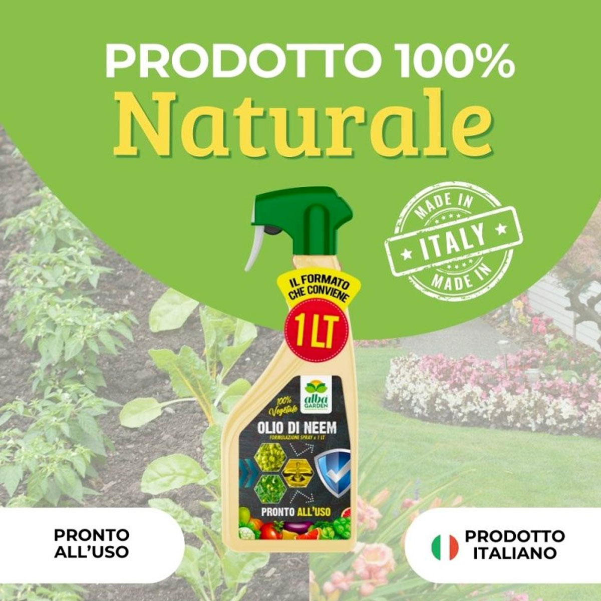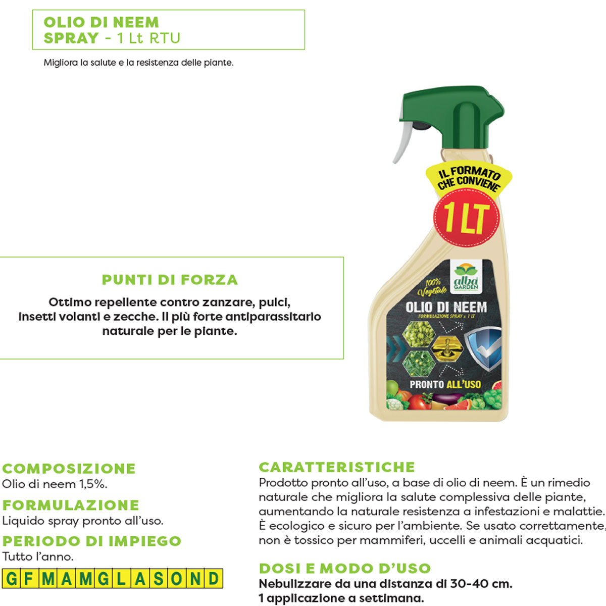 Prodotto pronto all’uso, a base di olio di neem. E’ un rimedio naturale che migliora la salute complessiva delle piante, aumentando la naturale resistenza a infestazioni e malattie. E’ ecologico e sicuro per l’ambiente. Se usato correttamente, non è tossico per mammiferi, uccelli e animali acquatici. COMPOSIZIONE: Olio di Neem 1,5%. DOSI E MODO D’USO: Dopo avere agitato il prodotto, nebulizzare le piante da una distanza di 30-40 cm. Effettuare gli interventi nelle ore più fresche della giornata, preferibilmente durante le ore serali. Per un uso ottimale del prodotto effettuare un’applicazione a settimana. Utilizzare nella fase vegetativa fino alla fioritura. Si consiglia di effettuare un test su una piccola parte della pianta, prima di procedere al trattamento esteso. Per le colture edibili, si consiglia di far trascorrere almeno 48 ore dal trattamento prima di consumare il raccolto. DOSE MEDIA E APPLICAZIONI: Nebulizzare da una distanza di 30-40 cm. 1 applicazione a settimana. PERIODO DI IMPIEGO: Tutto l’anno.