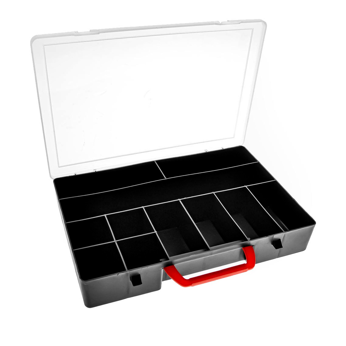 Descrizione Organizer classico, manico solido, coperchio trasparente, grande capacità, undici scomparti per piccoli oggetti.