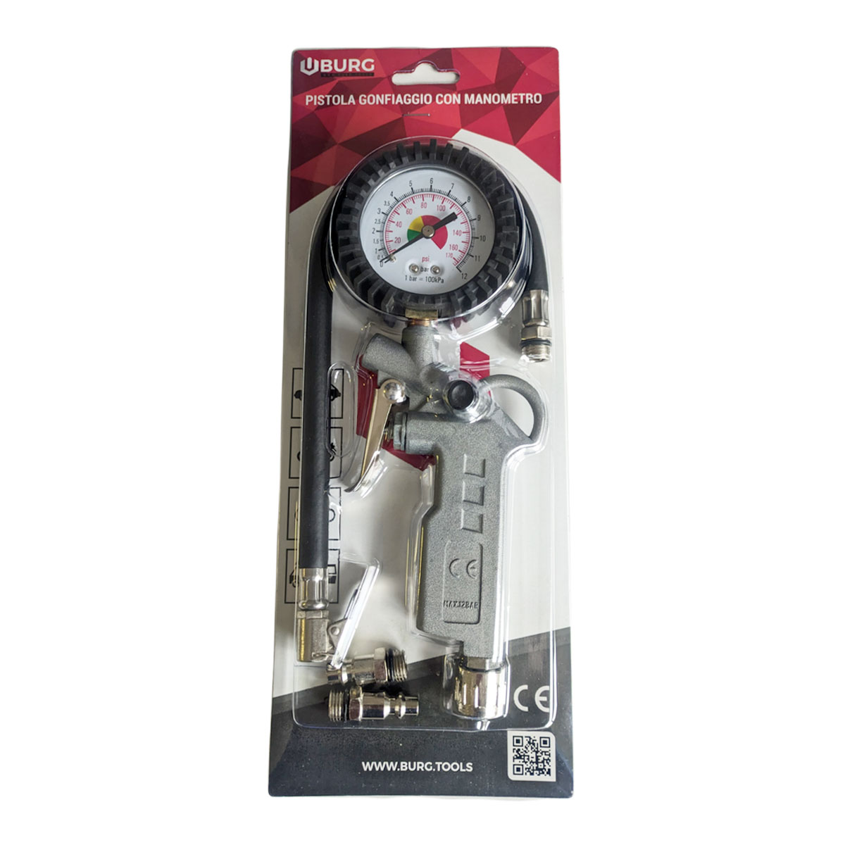 Pistola di gonfiaggio pneumatica ad aria compressa BURG con manometro di lettura incorporato in doppia scala bar psi. Lettura 0 – 12 bar. 3 diversi attacchi in dotazione.
