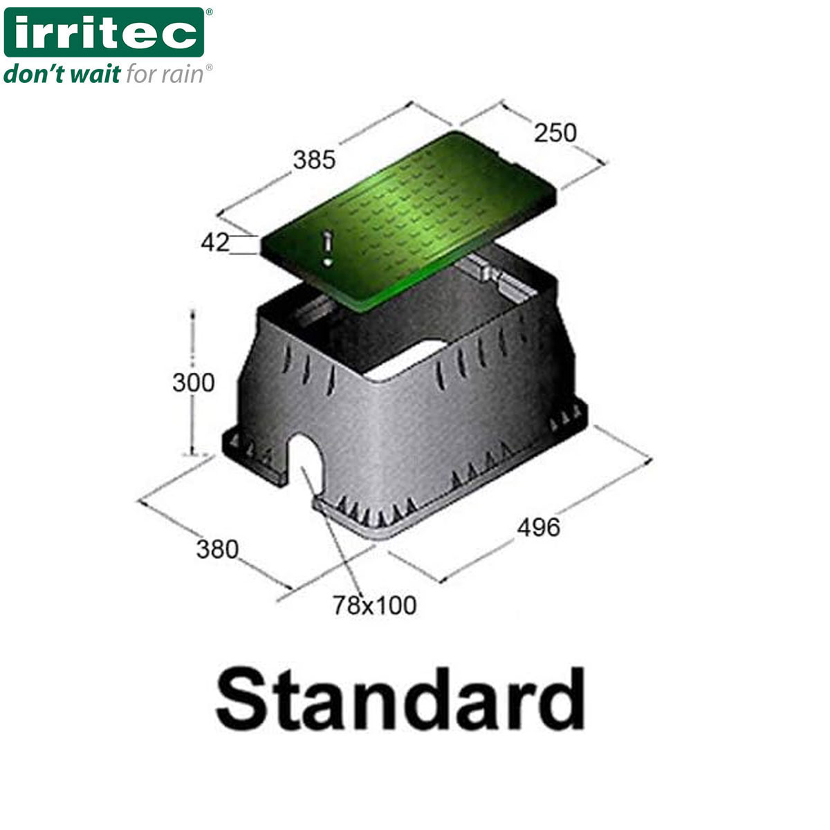 Creati principalmente per alloggiare elettrovalvole, saracinesche, idrovalvole e qualsiasi altro strumento interrato da ispezionare. Robusti e realizzati con materiali di prima scelta, i pozzetti sono resistenti alle intemperie e all’urto. Il bullone antivandalo e il controdado fungono da maniglia per il sollevamento del coperchio. I pozzetti permettono il passaggio di mezzi per la manutenzione del verde e di conseguenza sono indicati anche in parchi, campi sportivi e verde pubblico. Sono inoltre dotati di coperchio verde per integrarsi meglio nel tappeto erboso. Grazie al bordino “overlap” si eviterà l’inserimento di eventuali detriti. Base nera in polipropilene rinforzato. Bullone antivandalo INOX AISI 304 per modelli rettangolari. Carico max applicabile secondo norma UNI EN 124. Dimensioni: Base inferiore: 496×380 mm. Base superiore: 385×250 mm. Altezza: 300 mm.
