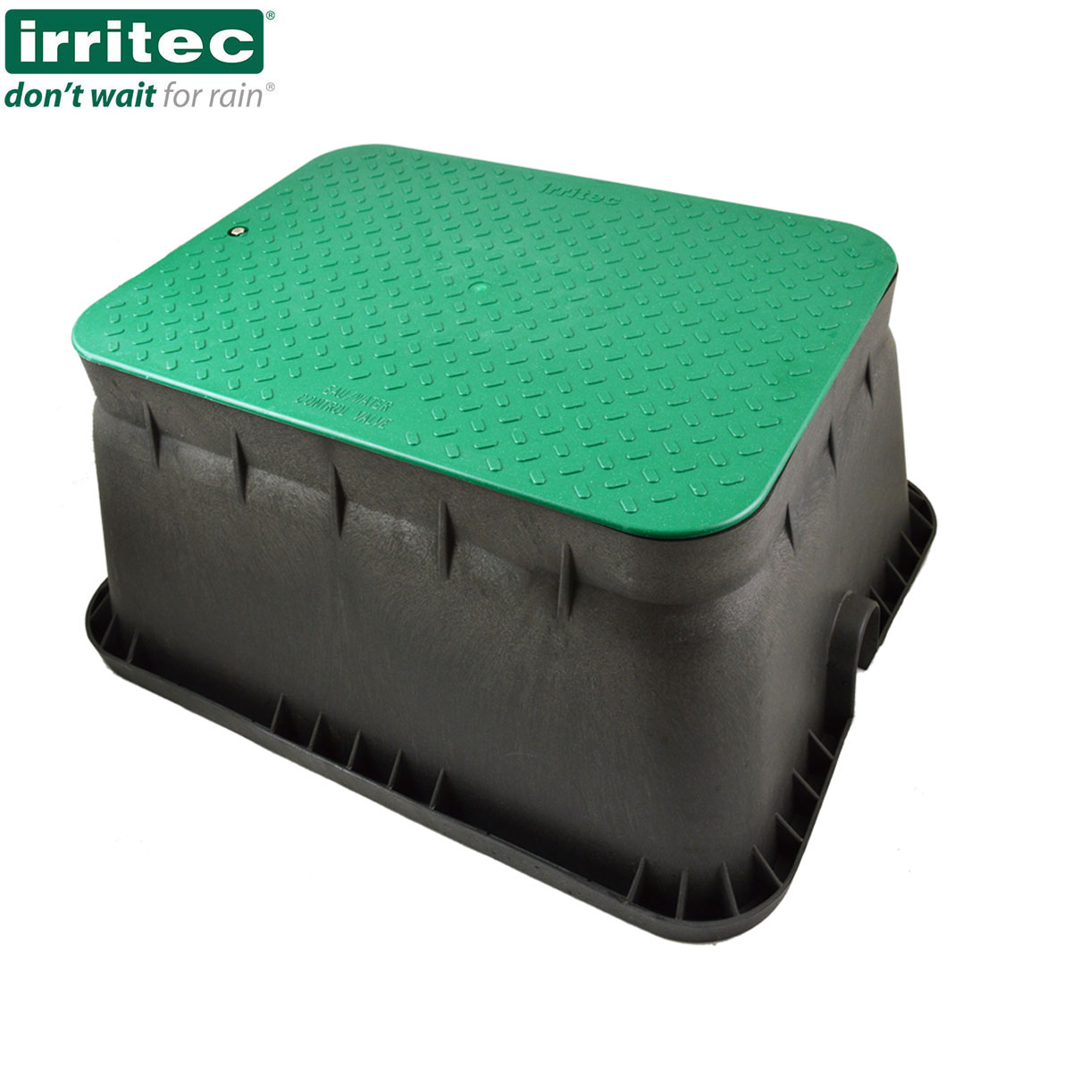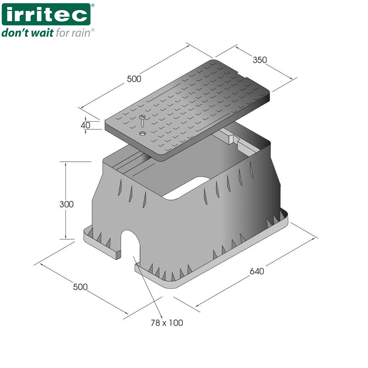 Creati principalmente per alloggiare elettrovalvole, saracinesche, idrovalvole e qualsiasi altro strumento interrato da ispezionare. Robusti e realizzati con materiali di prima scelta, i pozzetti sono resistenti alle intemperie e all’urto. Il bullone antivandalo e il controdado fungono da maniglia per il sollevamento del coperchio. I pozzetti permettono il passaggio di mezzi per la manutenzione del verde e di conseguenza sono indicati anche in parchi, campi sportivi e verde pubblico. Sono inoltre dotati di coperchio verde per integrarsi meglio nel tappeto erboso. Grazie al bordino ”overlap” si eviterà l’inserimento di eventuali detriti. Base nera in polipropilene rinforzato. Bullone antivandalo INOX AISI 304 per modelli rettangolari. Carico max applicabile secondo norma UNI EN 124. Dimensioni: – Base inferiore: 640×500 mm. – Base superiore: 500×350 mm. – Altezza: 300 mm.