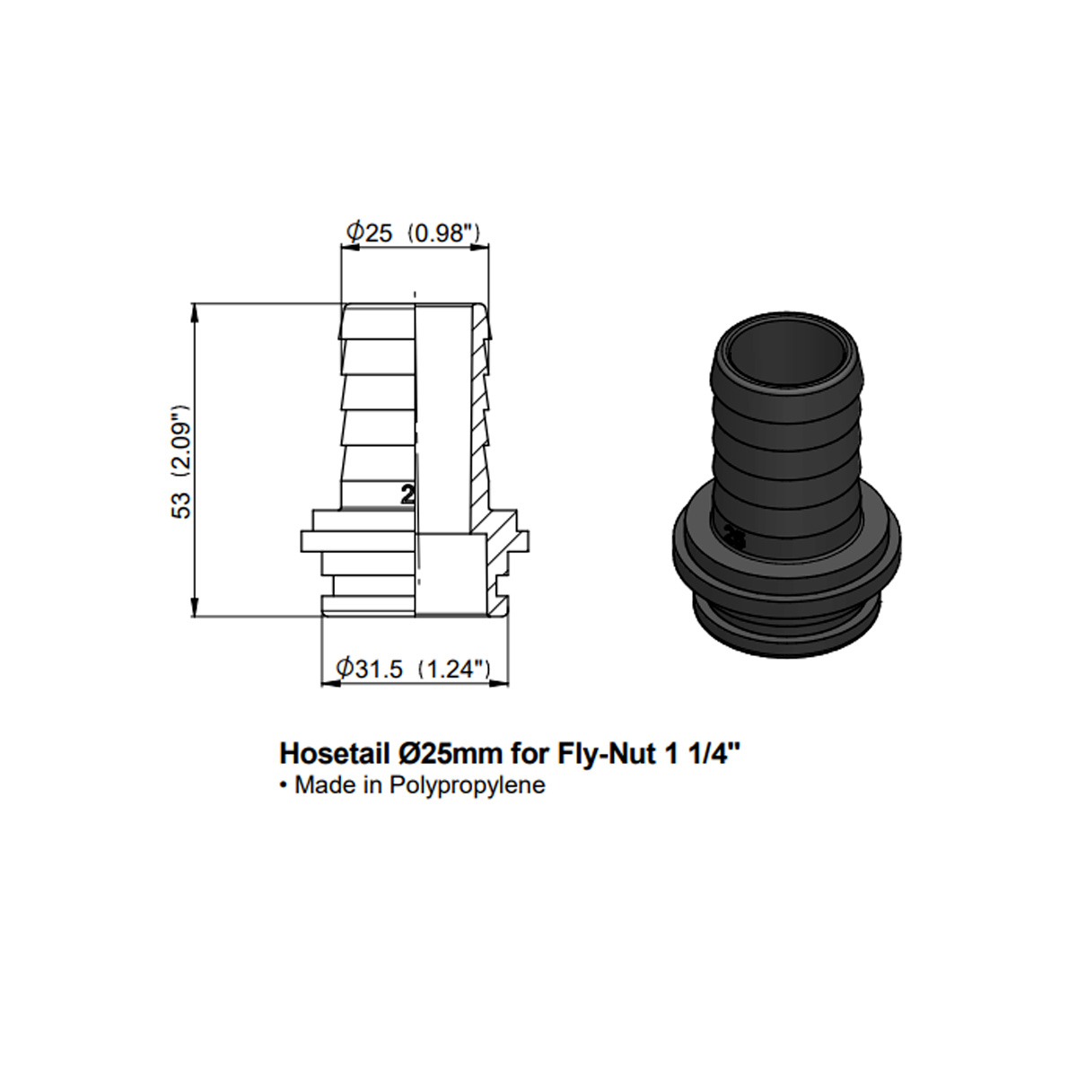 Raccordo per tubi flessibili per dado volante Fornito senza ghiera. Fatto in Polipropilene. DATI TECNICI: – Ø: 25 millimetri. – D1: 31,5 millimetri. – L: 53 millimetri.