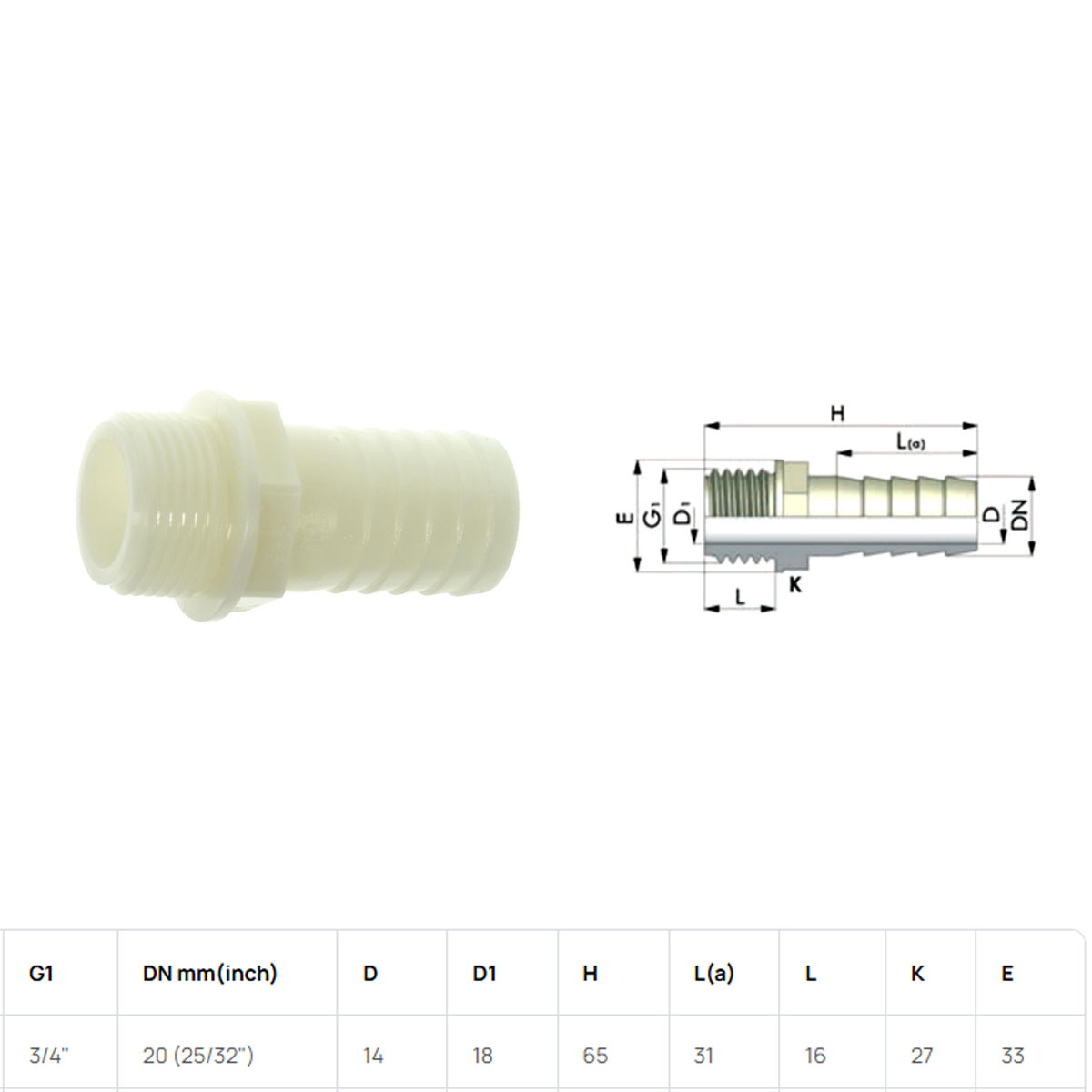 Raccordo Portagomma Dritto Maschio d. 20×3/4” – con filettatura GAS, in poliammide 66 (PA) – (nylon) per tubi flessibili. Estremità maschio filettata G1 (L a norma ISO 7/1) con sede O-ring.