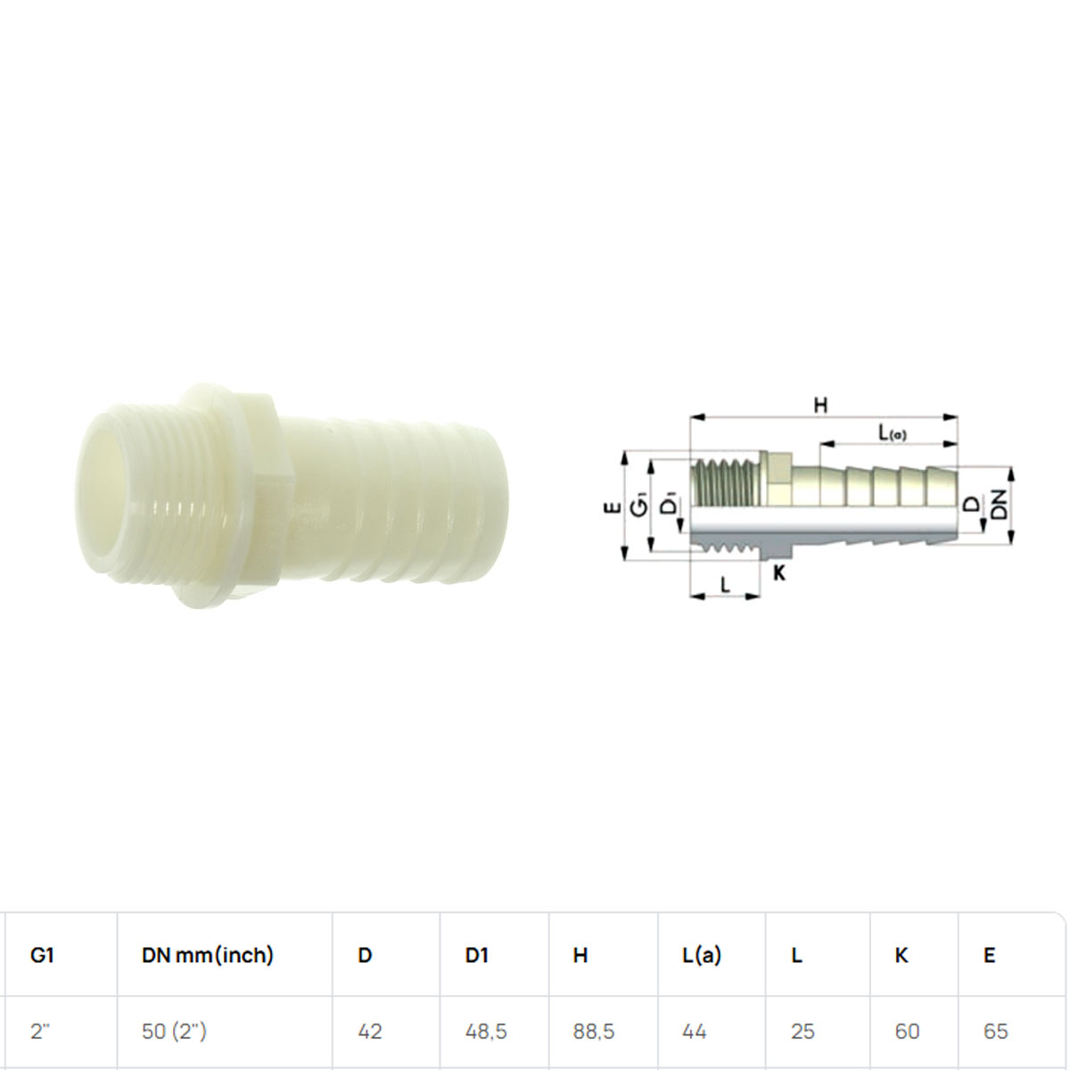 Raccordo Portagomma Dritto Maschio d. 50×2” – con filettatura GAS, in poliammide 66 (PA) – (nylon) per tubi flessibili. Estremità maschio filettata G1 (L a norma ISO 7/1) con sede O-ring.
