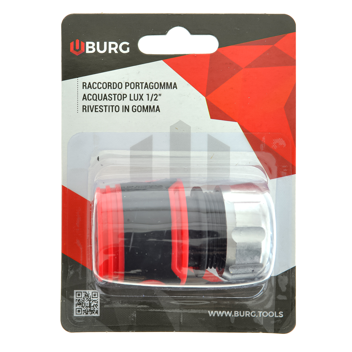 Raccordo rapido portagomma acquastop LUXURY 1/2″ BURG. Con il connettore rapido BURG con acquastop, puoi collegare in modo rapido e sicuro un tubo da giardino da 1/2″ ai componenti del sistema di irrigazione senza bisogno di attrezzi o morsetti. Stringendo la manopola, si ottiene un collegamento affidabile e a tenuta stagna senza bisogno di morsetti o fascette stringitubo. Il connettore rapido è realizzato in resistenti materiali ABS e PP, con un rivestimento in morbida gomma termoplastica (TPR) per un maggiore comfort e una presa migliore, anche su superfici bagnate. La valvola interna integrata interrompe automaticamente il flusso d’acqua quando un elemento collegato, come una pistola a spruzzo o un irrigatore, si stacca. Il prodotto è venduto sfuso. Caratteristiche: – Realizzato in materiali ABS e PP resistenti, rivestito in morbido TPR. – Progettato per collegare tubi da giardino da 1/2” con un connettore rapido. – Valvola automatica integrata per impedire il flusso d’acqua durante la sostituzione degli accessori. Dati tecnici: – Adatto per tubi da giardino da 1/2”.