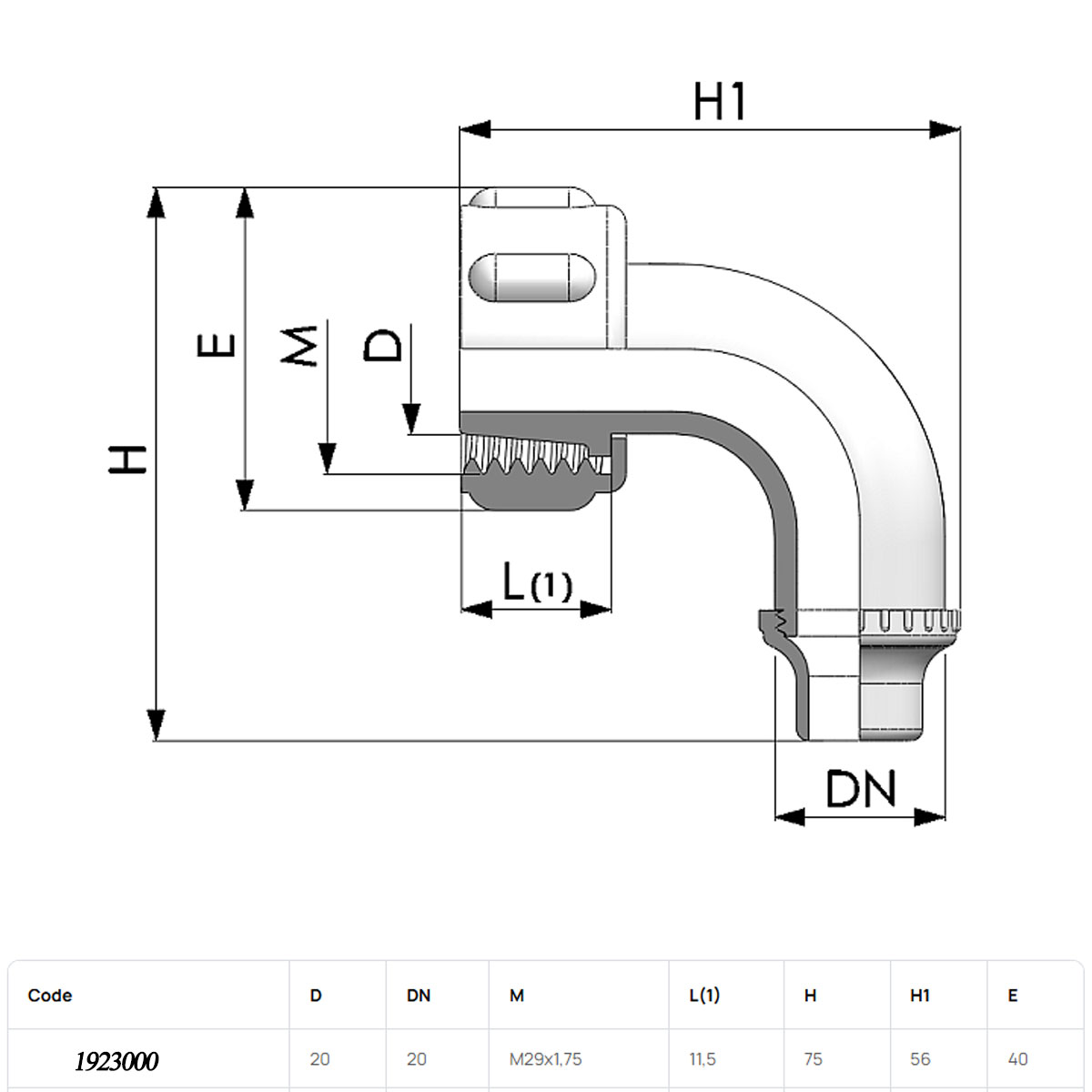 RACCORDO A GOMITO 90° con riempitore per bombola DN estremità maschio con attacco conico e ghiera. In polipropilene, atossico per alimenti.