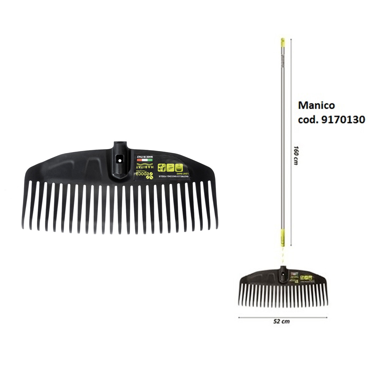 Ideale per raccogliere foglie, ramoscelli, fiori secchi pulire, rapidamente il prato, il giardino, e i cortili più ampi con il minimo sforzo. Utile sia per una pulizia superficiale sia per un’attività di raschiatura del tappeto erboso. I denti flessibili e resistenti si adattano a terreni irregolari anche in presenza di radici, la flessibilità e la distanza dei denti evitano che le foglie e lo sporco restino incastrati. Il Design comunitario registrato prevede un’inclinazione precisa dei denti per facilitare una grande capacità di raccolta. Realizzato in resina termoplastica rinforzata resistente allusura. Utilizzo in superfici di media ed ampie dimensioni. Dimensioni cm 53,0 x 29,0 x 36,5. Il manico corretto da utilizzare per questo prodotto è il: MANICO IN ALLUMINIO PER RASTRELLI HABITAT (cod. 9170130). Manico non incluso, da acquistare a parte.