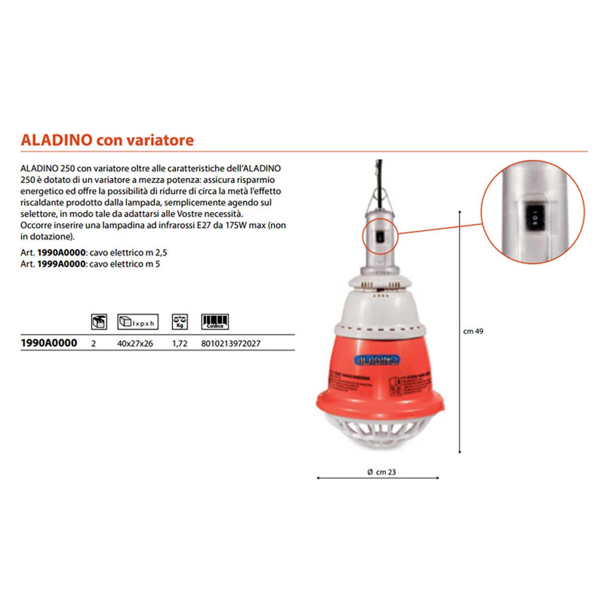 E dotato di un variatore a mezza potenza, assicura risparmio energetico ed offre la possibilità di ridurre di circa la metà l’effetto riscaldante prodotto dalla lampada, semplicemente agendo sul selettore, in modo tale da adattarsi alle vostre necessità. Occorre inserire una lampadina ad infrarossi E27 da 175W max (non in dotazione). Circonferenza: 23 cm. Altezza: 49 cm. Lampadina E27 (non inclusa). Lunghezza cavo: m 2.5.