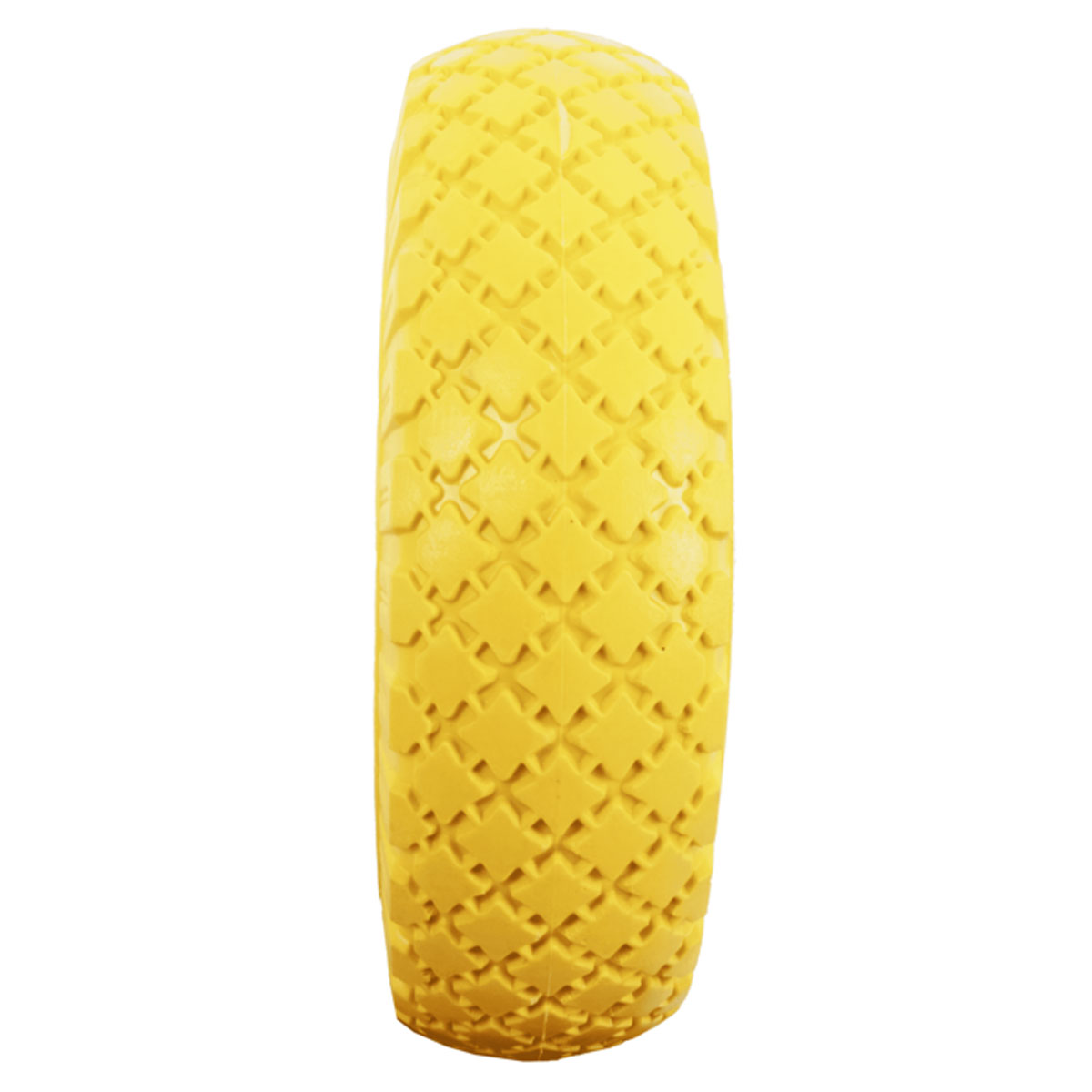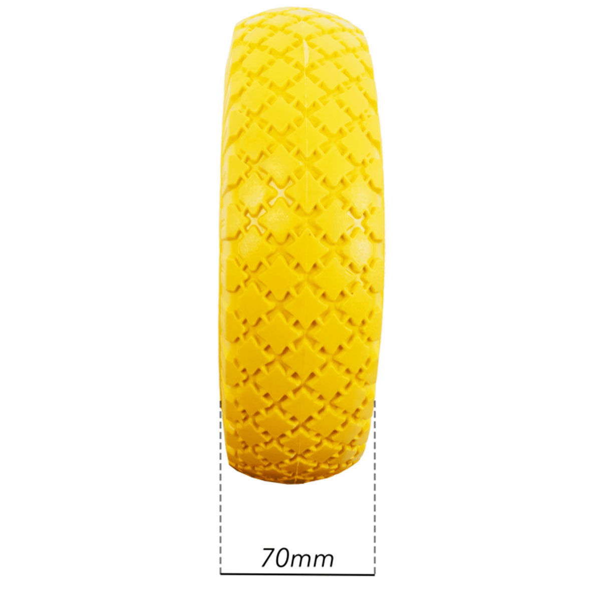Ruota antiforo riempita in schiuma poliuretanica, colore giallo, misura 3.00×4” con cerchio in plastica e cuscinetto. Diametro ruota 250 mm, Ø foro 20 mm, larghezza 70 mm, portata 50 kg.
