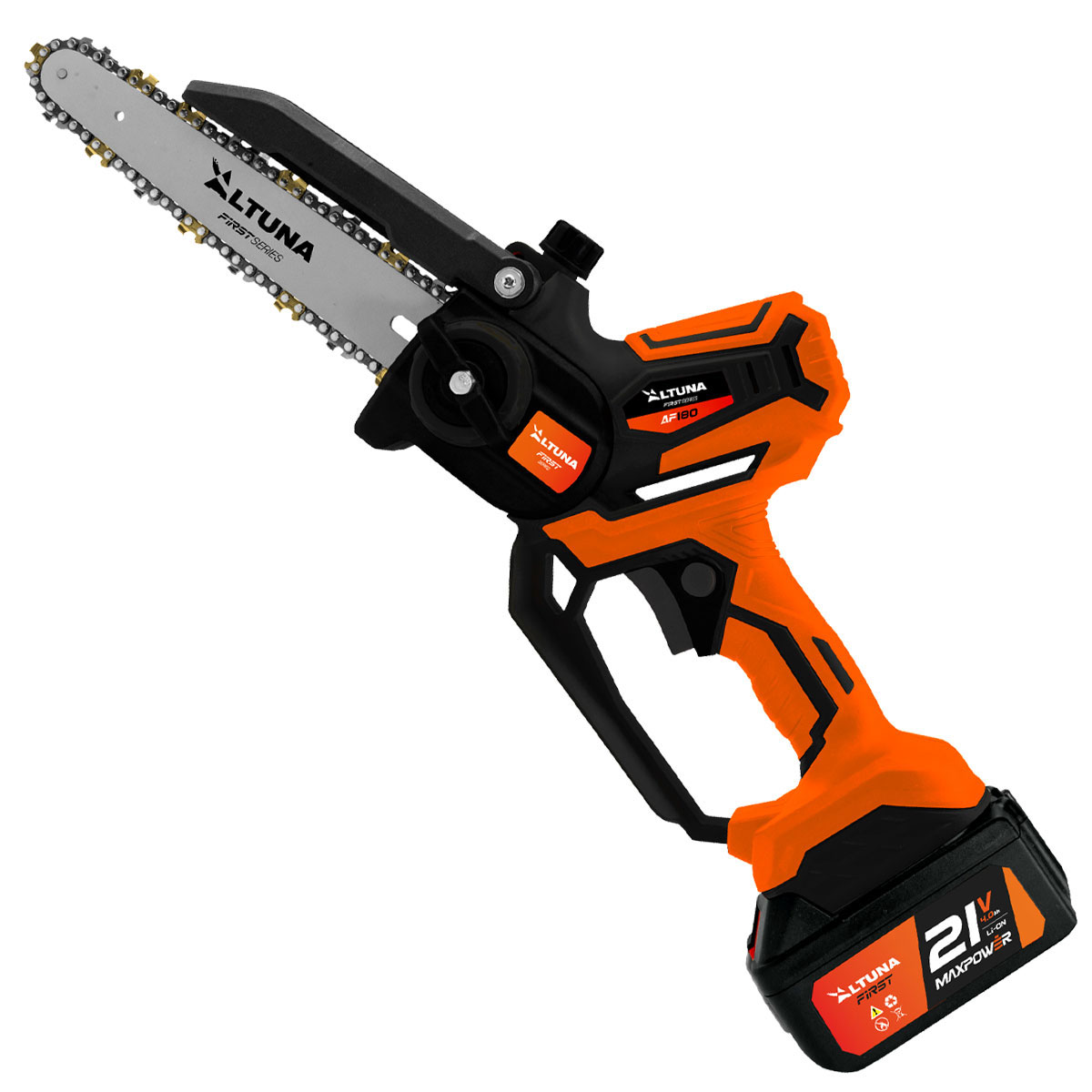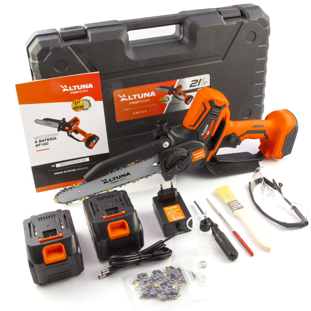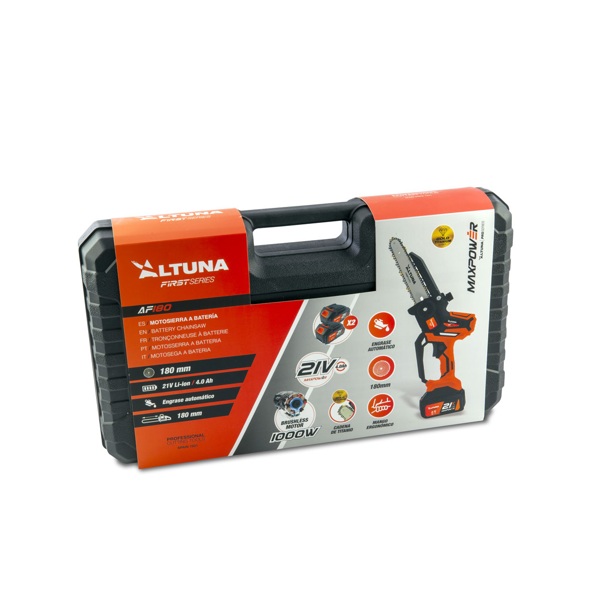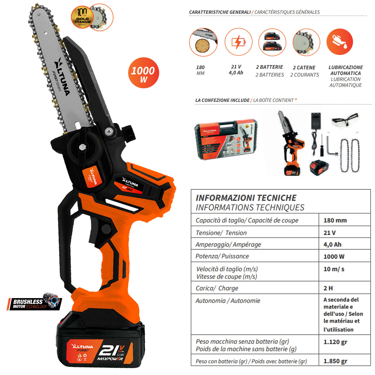Motosega elettrica a batteria AF180 con motore brushless da 800 W, batteria da 21 V 4,0 Ah e catena in titanio. Capacità di taglio fino a 180 mm per potatura e giardinaggio ausiliari. La motosega elettrica a batteria AF180 è progettata per offrire potenza, autonomia e precisione per tutti i tipi di lavori di potatura e giardinaggio. Il suo motore brushless da 800 W offre prestazioni costantemente elevate, maggiore efficienza energetica e una maggiore durata, anche in caso di utilizzo intensivo. Grazie alla batteria rimovibile agli ioni di litio da 21 V e 4,0 Ah, questa motosega garantisce un’eccellente autonomia, consentendo un taglio continuo e senza interruzioni. La batteria si ricarica facilmente, ottimizzando i tempi di lavoro e migliorando la produttività. Dotata di una catena in titanio ad alta resistenza, la AF180 consente una capacità di taglio fino a 180 mm , rendendola uno strumento versatile sia per i lavori di manutenzione del giardino domestico che per compiti ausiliari in ambienti di potatura professionale. Compatta, ergonomica e senza fili, questa motosega è progettata per offrire completa libertà di movimento, sicurezza e facilità d’uso, anche nelle aree difficili da raggiungere. Uno strumento robusto e preciso per chi esige qualità ed efficienza. Caratteristiche principali: – Motore brushless da 800 W – Batteria agli ioni di litio rimovibile : 21 V – 4,0 Ah. – Capacità di taglio fino a 180 mm. – Catena in titanio ad alte prestazioni e durevole. – Design wireless, senza cavi. – Ideale per lavori di giardinaggio e potatura ausiliaria. – Ottima autonomia e potenza costante. – Ergonomico, leggero e maneggevole. INFORMAZIONI TECNICHE: – Capacità di taglio: 180 millimetri. – Energia: 800 W. – Motore: Spazzole. – Sistema di sicurezza: Sì. – Velocità di taglio: 10 m/s. – Catena: titanio da 1/4”. – Serbatoio dell’olio: Sì. – Voltaggio: 21 Volt. – Amperaggio: 2,0 Ah. – Peso senza batteria: 845 grammi. – Peso con batteria: 1,175 grammi.