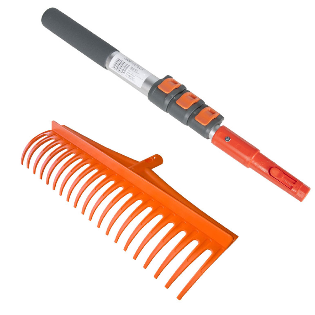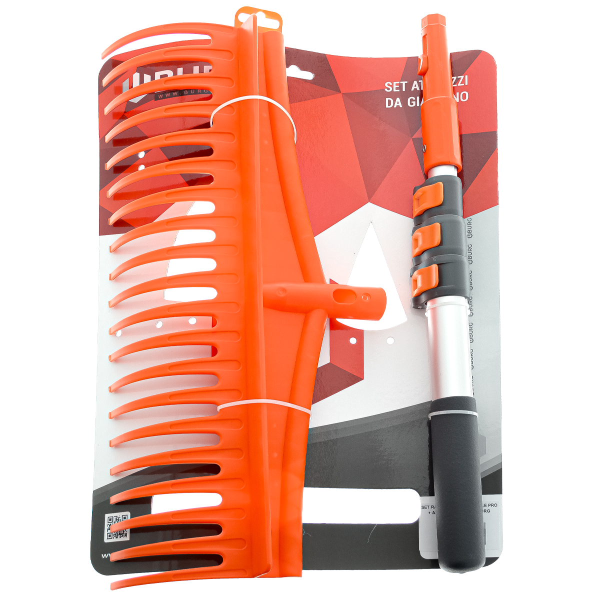 Set di attrezzi da giardinaggio BURG include: – Rastrello Professionale universale. – Asta telescopica 50 – 120 cm Sistema Clik. Perfetto per la manutenzione del giardino. Permette di rimuovere anche le foglie più piccole ed è utilizzato dai professionisti per la loro eccezionale e inalterabile durata nel tempo. Dettagli del rastrello: – Numero di denti: 19. – Lunghezza del dente: 10 cm. – Larghezza di lavoro: circa 45 cm. – Altezza rastrello: circa 6 cm. – Colore: arancione. Il manico telescopico consente di regolarne la lunghezza da 50 a 120 cm. Il design telescopico consente inoltre di ripiegare il manico in dimensioni ridotte, il che ne facilita notevolmente lo stoccaggio. Il manico è realizzato con materiali resistenti e durevoli, che garantiscono un utilizzo senza problemi per molti anni. I componenti del set sono stati realizzati in Europa con plastica di altissima qualità.
