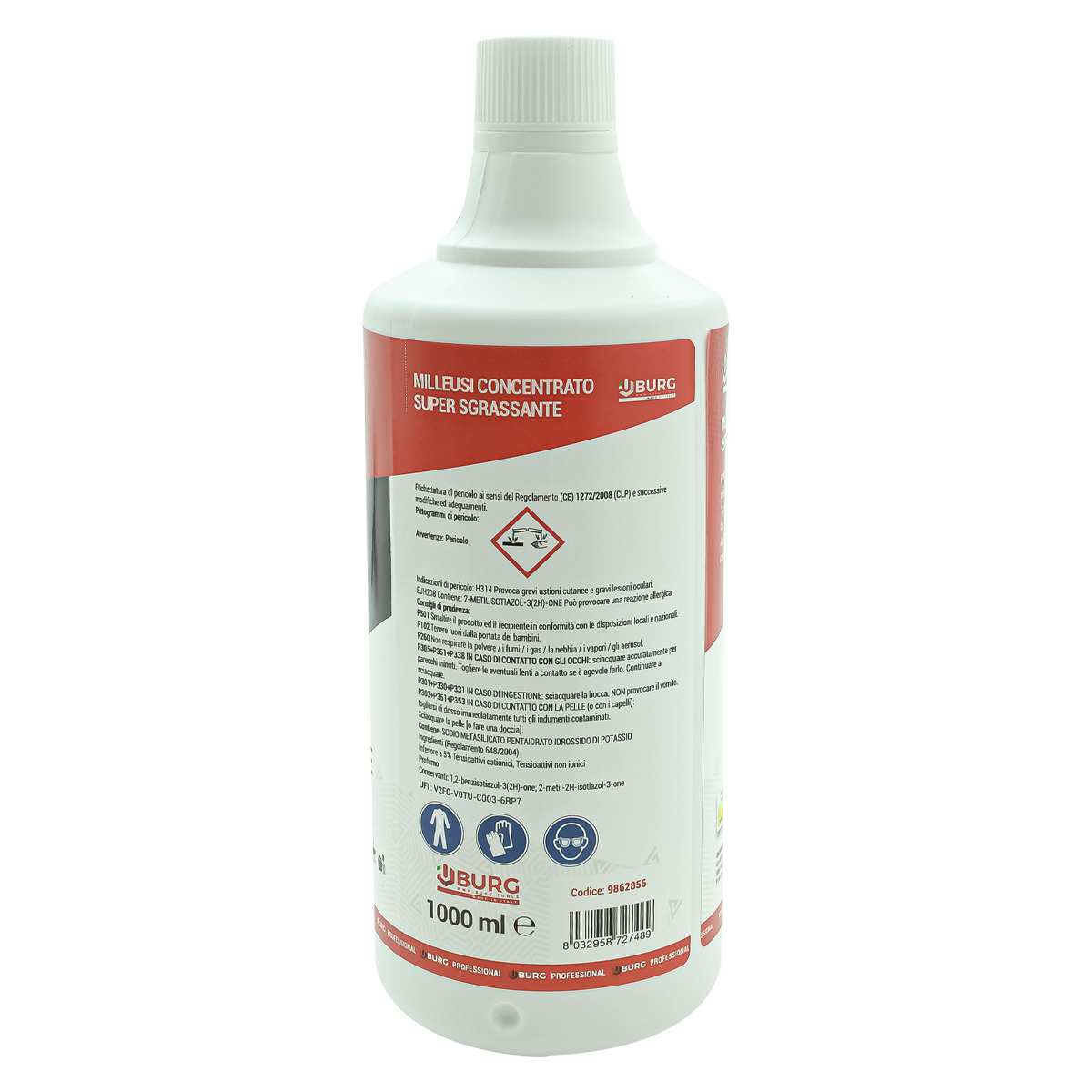 Il MILLE USI BURG è uno sgrassatore concentrato e può essere utilizzato in molteplici operazioni di pulizia normale, profonda e gravosa senza intaccare metalli, materiali plastici e altre superfici. 1000 USI sgrassatore concentrato multiuso garantisce una perfetta pulizia senza particolari operazioni manuali. Il prodotto non intacca l’alluminio se utilizzato nelle corrette diluizioni. Lo sgrassatore concentrato multiuso BURG è: – Efficace: pulisce perfettamente. – Multifunzione: idoneo per svariate applicazioni di pulizia: ceramiche, plastiche, metalli, legno. APPLICAZIONI E UTILIZZO di 1000 USI sgrassatore concentrato multiuso: AUTO – CASA – NAUTICA – INDUSTRIA – FOOD. – Ottimo per la pulizia dei condizionatori e climatizzatori. – Idoneo per tutti i materiali e le superfici. Anche per alluminio se diluito correttamente. MODALITÀ DI UTILIZZO di mille usi sgrassatore BURG concentrato: – Pronto uso: tal quale. – Concentrato: dal 5-10% in acqua per pulizie normali – al 50% in acqua per pulizie gravose.