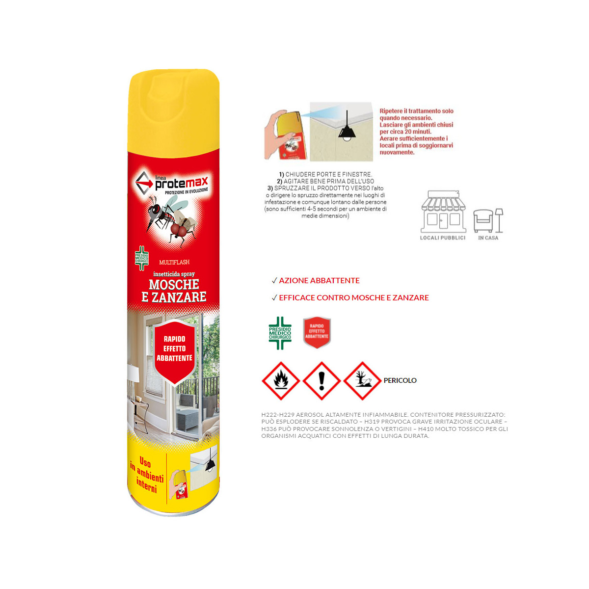 INSETTICIDA MOSCHE E ZANZARE SPRAY. Caratteristiche: insetticida abbattente non residuale. Indicato per: mosche, zanzare in ambiente interno domestico. Composizione: Tetrametrina 0,20%, Piperonilbutossido 0,60%. Registrazione: Multiflash – Presidio Medico Chirurgico – Reg. n. 18780