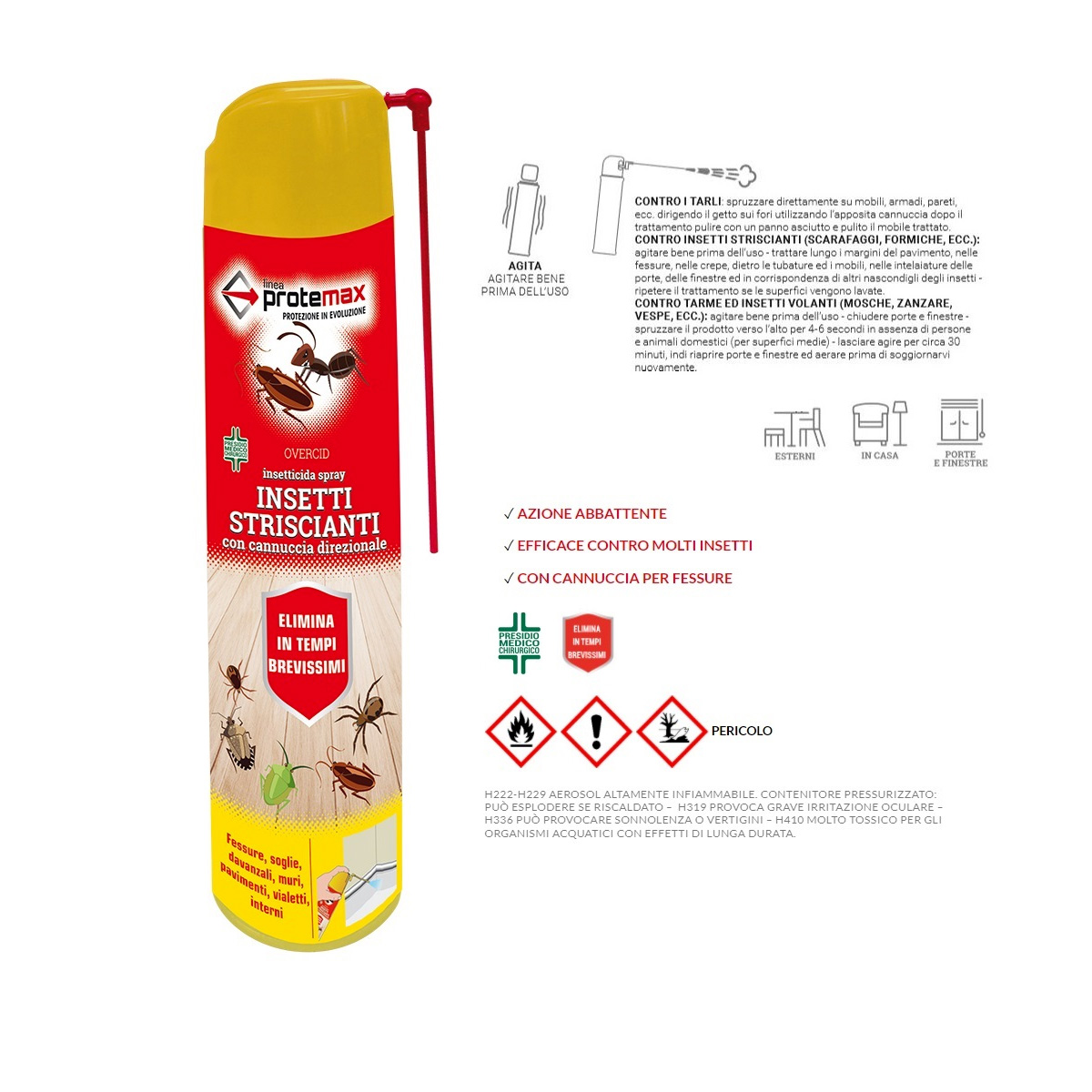 Insetticida spray pronto alluso a base di piretroidi con cannuccia per trattamenti localizzati. La formula garantisce unazione abbattente. Indicato per: tarli, tarme, acari della polvere, formiche, scarafaggi, pulci, ecc… Insetti volanti come: mosche, zanzare, vespe, cimici, tafani. Ideale per lutilizzo in ambienti esterni alla casa, vialetti, soglie, finestre, muri perimetrali, battiscopa, ecc. Composizione: Deltametrina 0,10%. Tetrametrina 0,20%. Piperonilbutossido 0,60%. Registrazione: Overcid Presidio Medico Chirurgico Reg. n.18737.