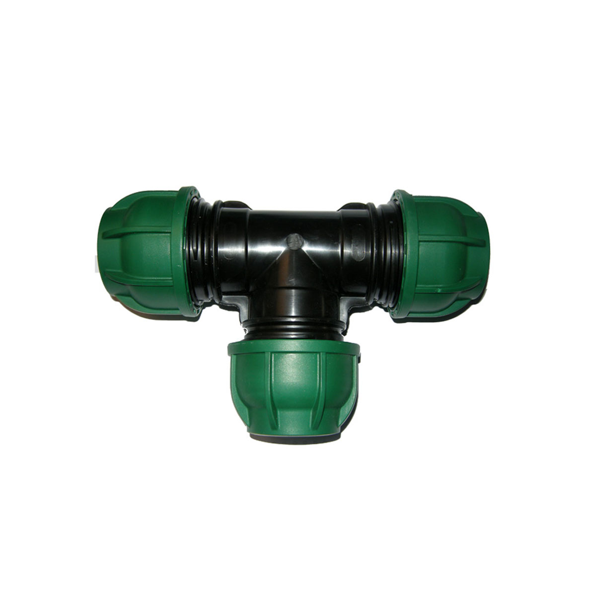 Raccordo a compressione Tee 25x25x25 per tubi in PE. Pressione massima di esercizio 10 bar.