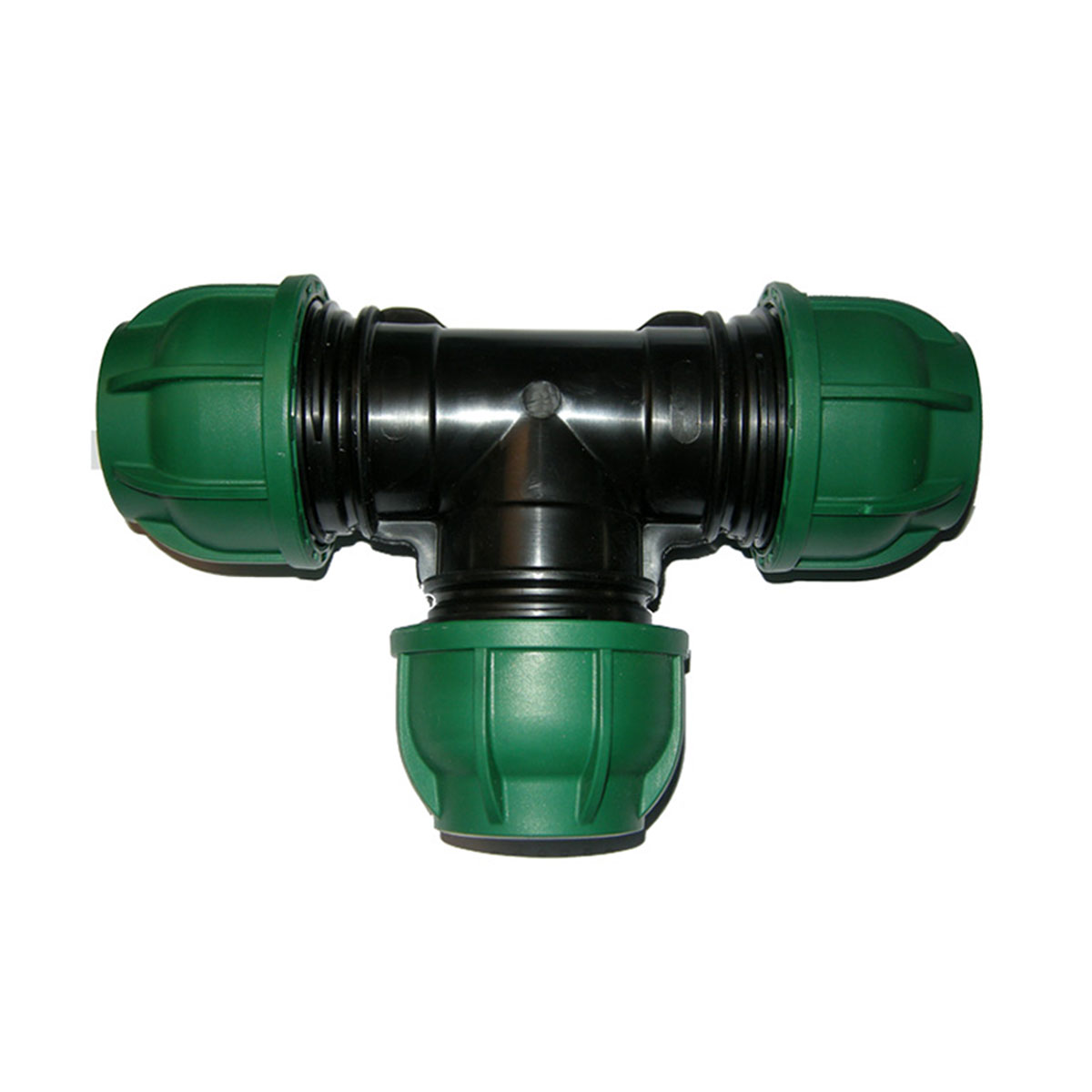 Raccordo a compressione Tee 50x50x50 per tubi in PE. Pressione massima di esercizio 10 bar.