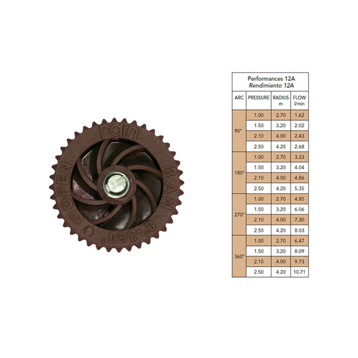 Gli ugelli/testine per irrigazione RAIN ad arco regolabile, disponibili nelle configurazioni 10A, 12A, 15A, sono progettati per adattarsi a tutti i tipi di angolazione, garantendo la massima flessibilità in tutti i giardini. La testina per irrigazione offre getti di spruzzo di qualità superiore, codificati a colori per una facile identificazione, distribuzione uniforme dell’acqua, efficienza idrica e basse portate. La testina dell’irrigatore è dotata di filtri extra lunghi che prolungano i tempi di pulizia e sono compatibili con tutti i corpi con filettatura maschio. può irrigare da 1,7 m fino a 5,7 m di distanza. Teste statiche La testina dell’irrigatore ha una gittata: 10A = 3,5 m (cod. 9160131). 12A = 4,2 m (cod. 9160132). 15A = 5,2 m (cod. 9160133). La testina dell’irrigatore ha un arco regolabile: 0° – 360°.