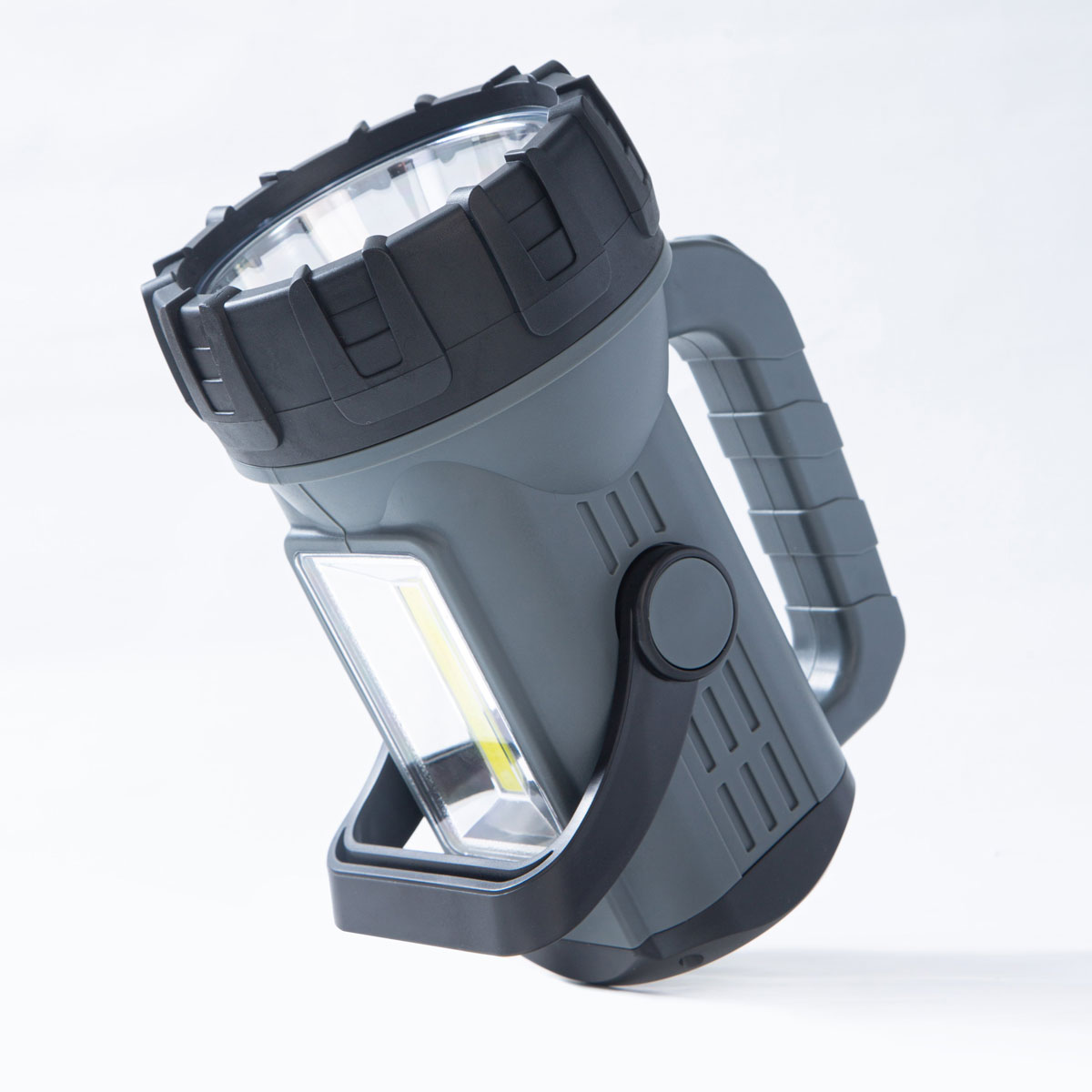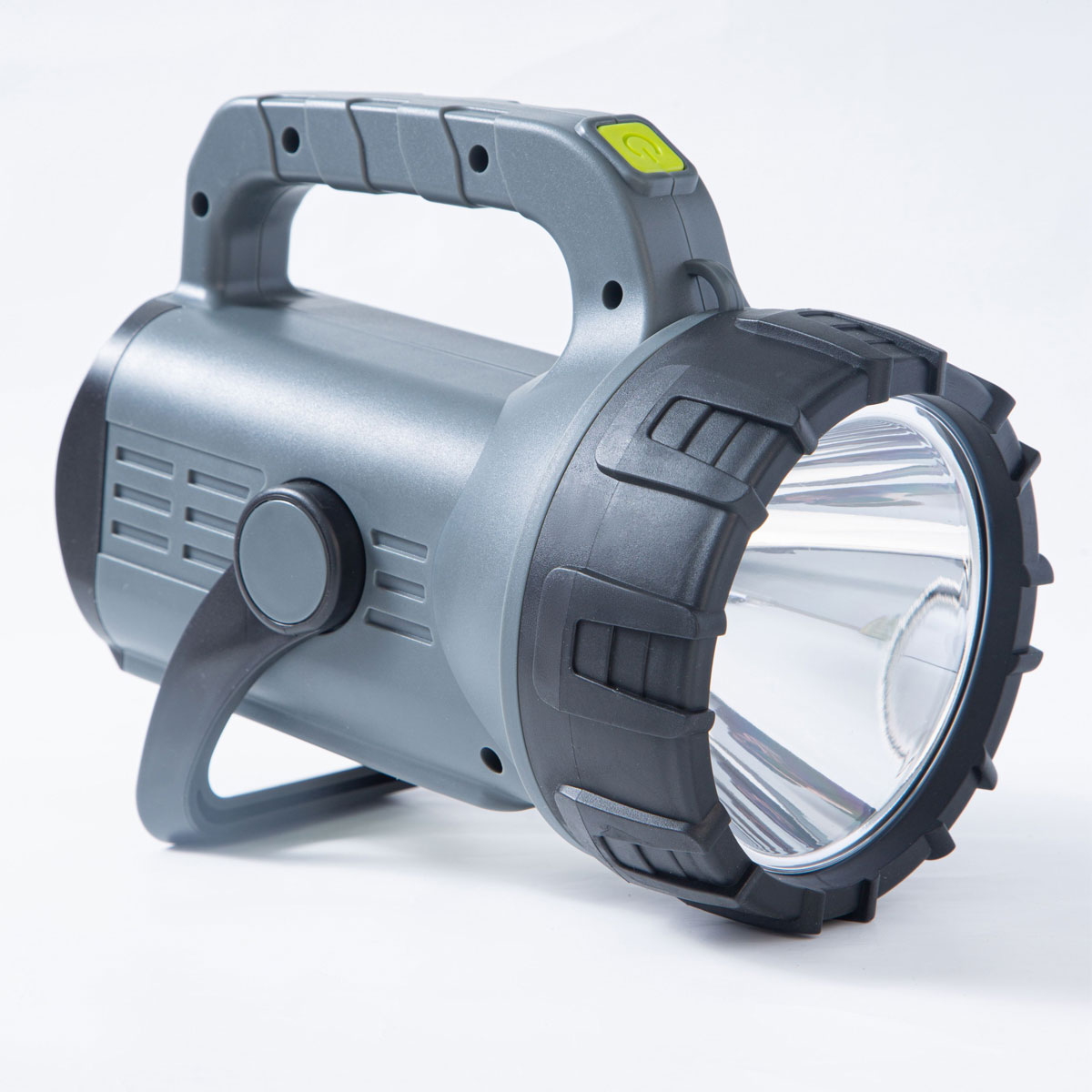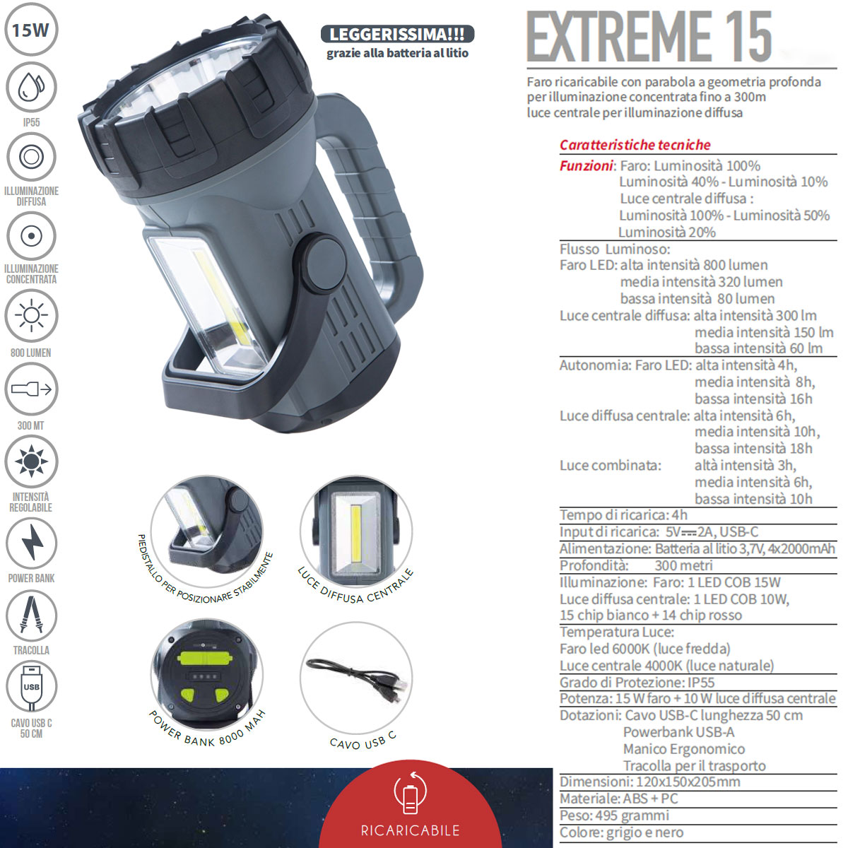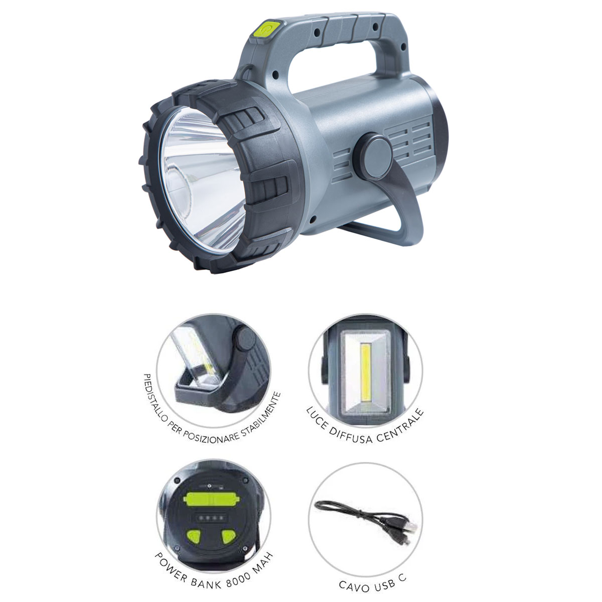 Torcia ricaricabile con parabola e geometria profonda per illuminazione concentrata fino a 300 metri. Luce centrale per illuminazione diffusa. Powerbank da 8000 mAh con USB-a. In dotazione: cavo USB-C e tracolla per il trasporto. Caratteristiche tecniche: 1) Funzioni: Faro: Luminosità 100% – Luminosità 40% – Luminosità 10%. 2) Luce centrale diffusa: Luminosità 100% – Luminosità 50% – Luminosità 20%. Flusso Luminoso: 1) Faro LED: alta intensità 800 lumen, media intensità 320 lumen, bassa intensità 80 lumen. 2) Luce centrale diffusa: alta intensità 300 lumen, media intensità 150 lumen, bassa intensità 60 lumen. Autonomia: 1) Faro LED: alta intensità 4h, media intensità 8h, bassa intensità 16h. 2) Luce diffusa centrale: alta intensità 6h, media intensità 10h, bassa intensità 18h. 3) Luce combinata: altà intensità 3h, media intensità 6h, bassa intensità 10h. Dettagli tecnici: – Tempo di ricarica: 4h. – Input di ricarica: 5V 2A, USB-C. – Alimentazione: Batteria al litio 3,7V, 4x2000mAh. – Profondità: 300 metri. – Illuminazione: Faro: 1 LED COB 15W. – Luce diffusa centrale: 1 LED COB 10W. – 15 chip bianco + 14 chip rosso. – Temperatura Luce: 1) Faro led 6000K (luce fredda). 2) Luce centrale 4000K (luce naturale). – Grado di Protezione: IP55. – Potenza: 15 W faro + 10 W luce diffusa centrale. – Dotazioni: Cavo USB-C lunghezza 50 cm. – Powerbank USB-A. – Manico Ergonomico. – Tracolla per il trasporto. – Dimensioni: 120x150x205mm. – Materiale: ABS + PC. – Peso: 495 grammi. – Colore: grigio e nero.