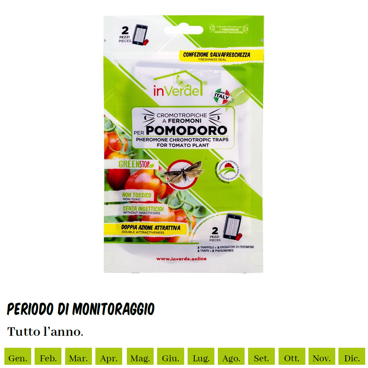 Dispositivo per il monitoraggio della tignola del pomodoro (Tuta absoluta). La trappola cromotropica a feromoni per pomodoro è una trappola adesiva associata ad uno specifico erogatore di feromone. Gli insetti target vengono attirati dall’azione cromotropica svolta dal colore nero della trappola e dai feromoni emessi dallo specifico erogatore, rimanendo invischiati sulla superficie adesiva. I materiali impiegati per questa trappola resistono agli agenti atmosferici, garantendo fino ad 1 mese di efficacia. Si utilizza sulle piante di pomodoro. Il prodotto è composto da: – Trappola cromotropica in PP collata su entrambe le superfici. – Carta siliconata bianca a un colore nero con istruzioni per il rilascio. – Fascetta zigrinata per il fissaggio del dispositivo integrata nella trappola. – Erogatore di feromone in silicone confezionato in film barriera (PET-Alu-PE). Misure e dimensioni: – Lunghezza: 95 mm. – Altezza: 158 mm. – Area di spalmatura: 2 aree (fronte e retro) 70 mm x 100 mm. – Quantità di colla utilizzata: 1,26 g. – Colore: nero per il supporto collato, rosso per l’erogatore di feromone. Modalità d’uso: Inserire l’erogatore di feromoni specifico per il monitoraggio della tignola del pomodoro (Tuta absoulta) nell’apposito foro. Appendere la trappola alla pianta di pomodoro, ad un’altezza da terra di circa 0,30-1,20 metri, in rapporto allo sviluppo delle piante, usando l’apposita fascetta zigrinata presente sul lato della trappola, staccandola parzialmente ed inserendola nel foro. Rimuovere la carta siliconata. Area di copertura teorica: Posizionare 1 trappola per m2. Periodo di monitoraggio consigliato: tutto l’anno, soprattutto da aprile a settembre. Frequenza controlli consigliata: Monitorare la trappola settimanalmente. Sostituire la trappola dopo 30 giorni o prima, qualora la superficie adesiva fosse piena di insetti.